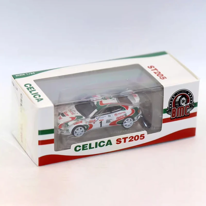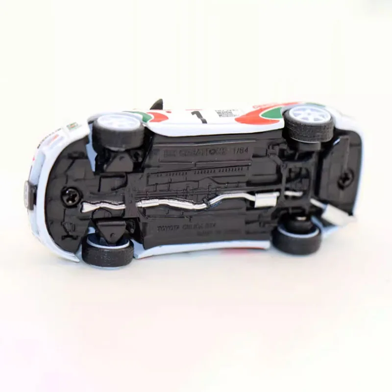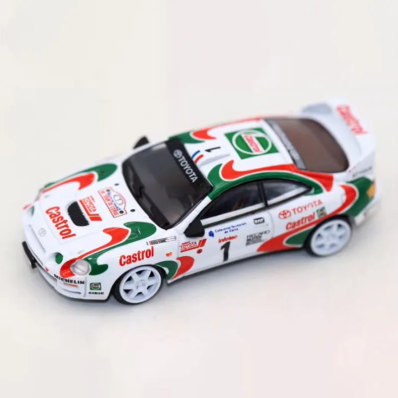 This 1/64 scale diecast model captures the essence of the Toyota Celica ST205, showcasing a stunning white exterior complemented by vibrant green and red accents. The sleek, sporty design features a slanted front with a black grille and clear windshield, enhancing its dynamic appearance. With intricate detailing like the “Toyota” logo and number “1” on the hood, as well as bold patterns reminiscent of racing stripes on the sides, this model not only serves as a collectible but also as a decorative piece. It's ideal for enthusiasts who appreciate both style and craftsmanship in miniature automobiles.