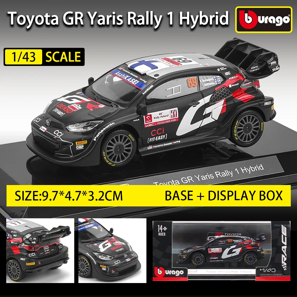 Experience the thrill of rally racing with this expertly crafted diecast model of the Toyota GR Yaris Rally1 Hybrid. Sized at 1:43 scale, this model captures every detail of the real race car, from its sleek, matte black finish to vibrant livery decals. The realistic aerodynamic features include a large rear spoiler, front splitter, and accurately rendered headlights and grille. The finely sculpted body showcases side mirrors, door handles, and window frames, adding to its authenticity. The rubber tires with detailed rims provide a lifelike appearance and are mounted on a sturdy plastic case. Perfect for collectors and enthusiasts, this model boasts educational flashing components and full safety certification, making it a true display piece or educational toy suitable for ages 4 and above.