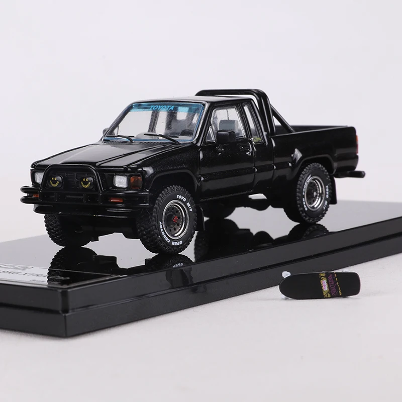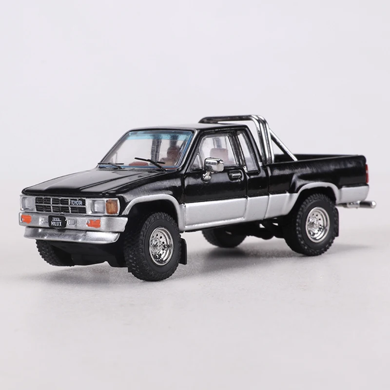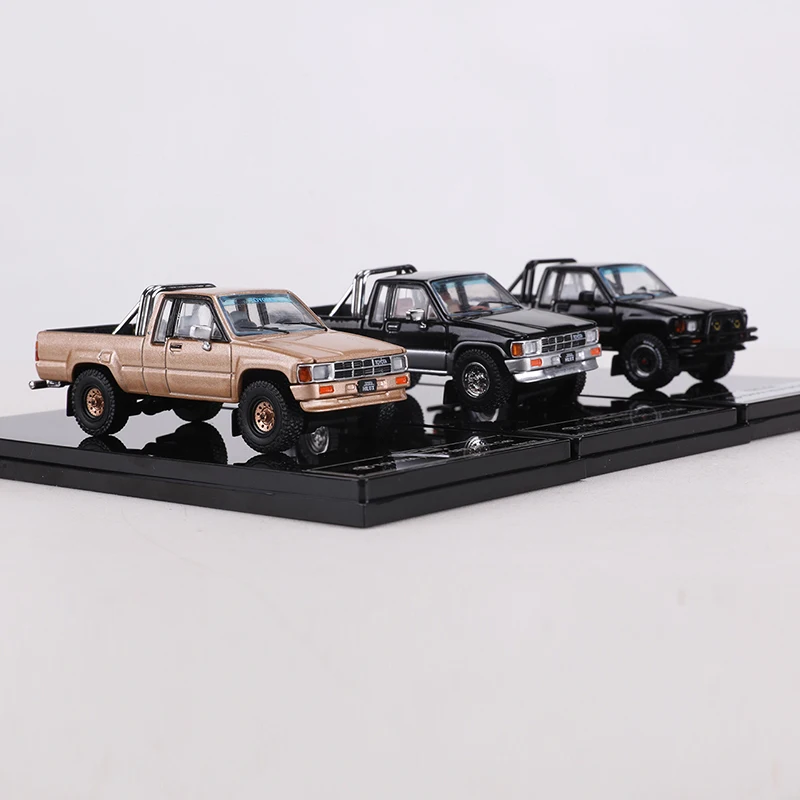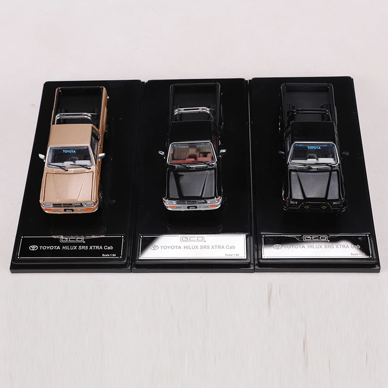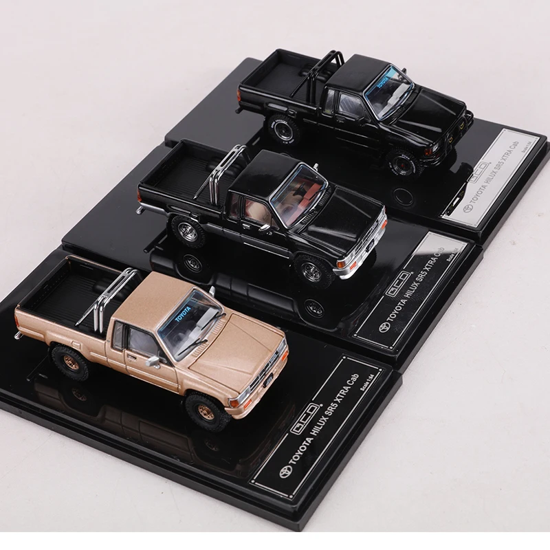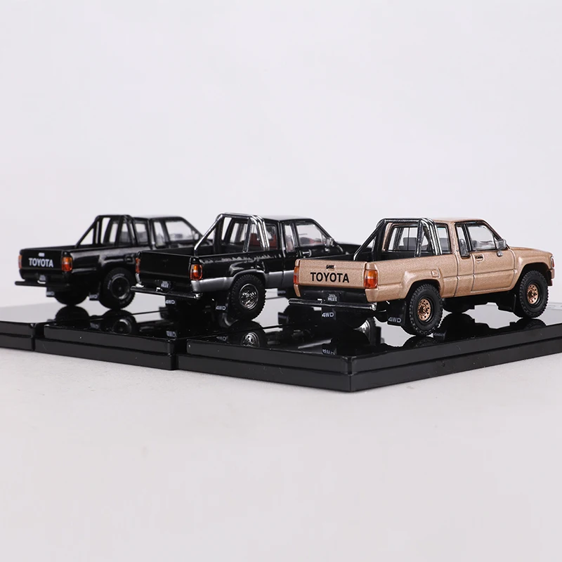 Experience the craftsmanship and realism of this highly detailed 1:64 scale diecast model car of the Toyota Hilux SR5 Xtra Cab Pickup. Crafted from durable metal, it captures the essence of the full-sized vehicle with lifelike proportions and intricate details. The model is available in three stunning finishes—beige with a metallic sheen, matte black or gunmetal gray for a sleek modern look, and a glossy black or deep charcoal with reflective surfaces for added sophistication. Each version features realistic front grilles, headlights, and well-defined body panels, showcasing meticulous design. Transparent windows reveal detailed interiors, while the black wheels with intricate rims and realistic tire treads enhance the rugged appearance. It makes an excellent display piece or gift for enthusiasts who appreciate precision craftsmanship and quality collectible models.