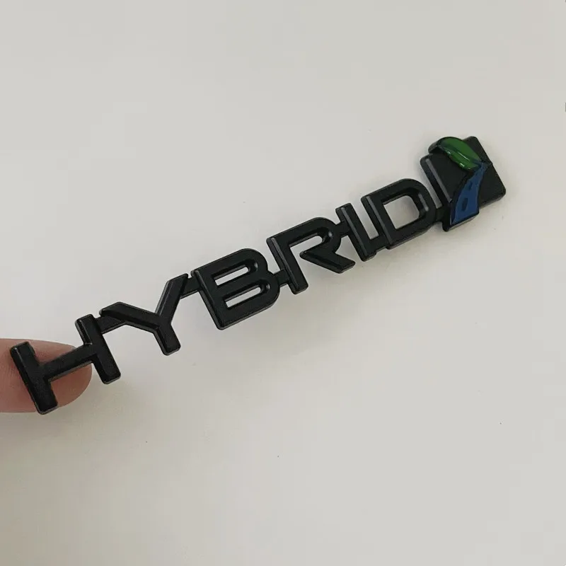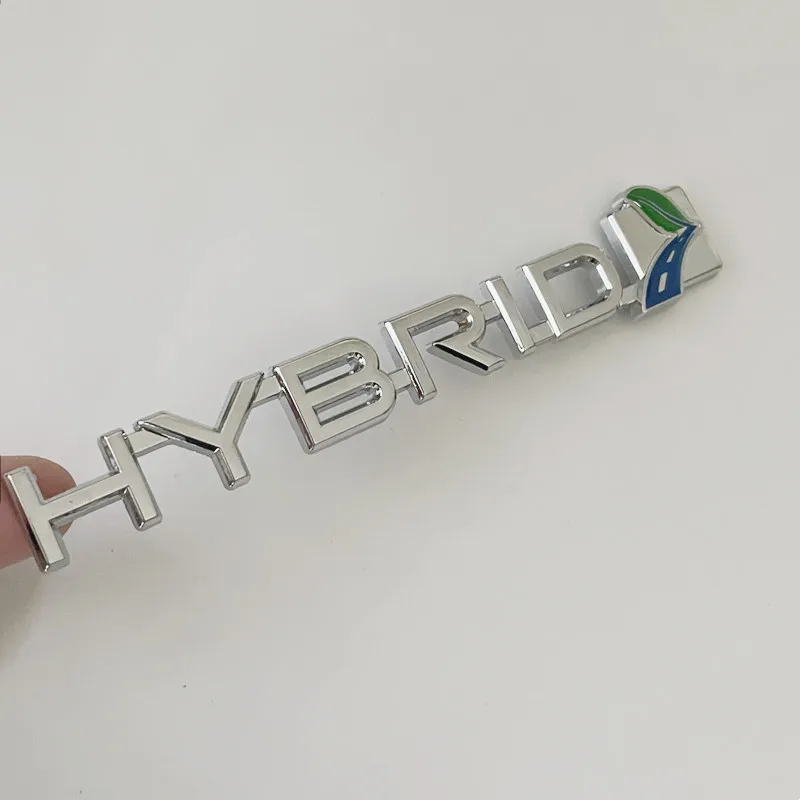 - The emblem features raised, three-dimensional “HYBRID” letters paired with a stylized leaf and road graphic, emphasizing eco-friendly driving in a modern design.