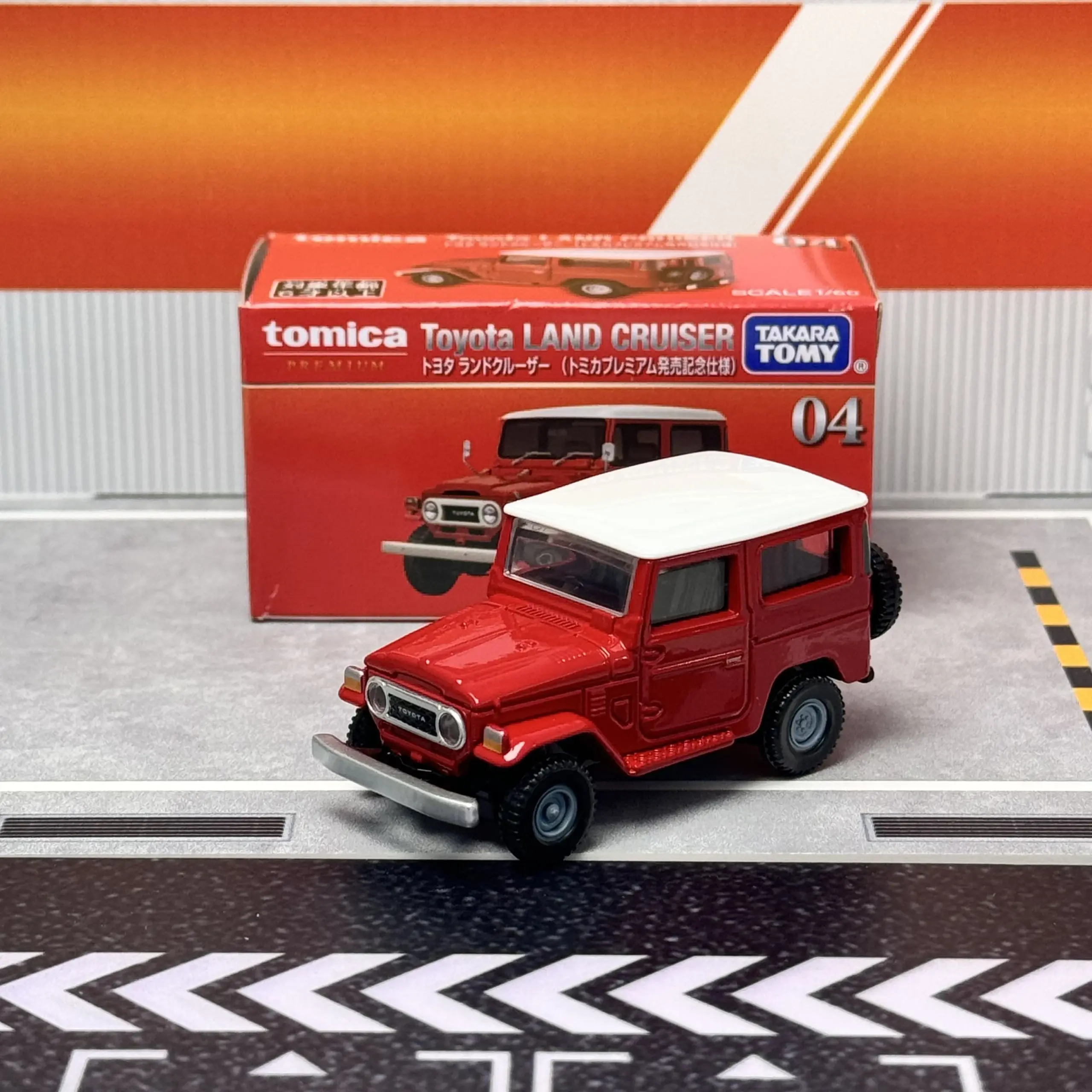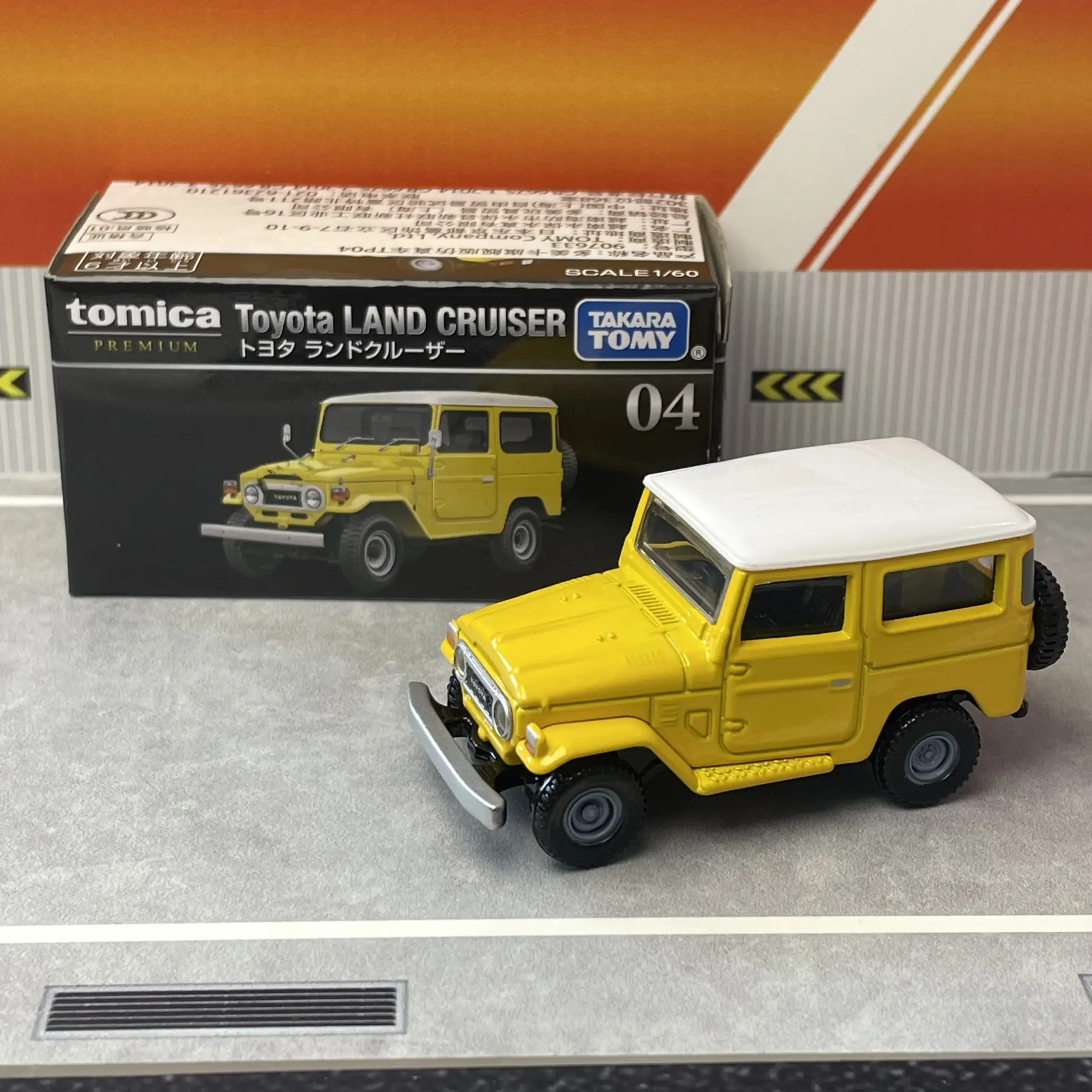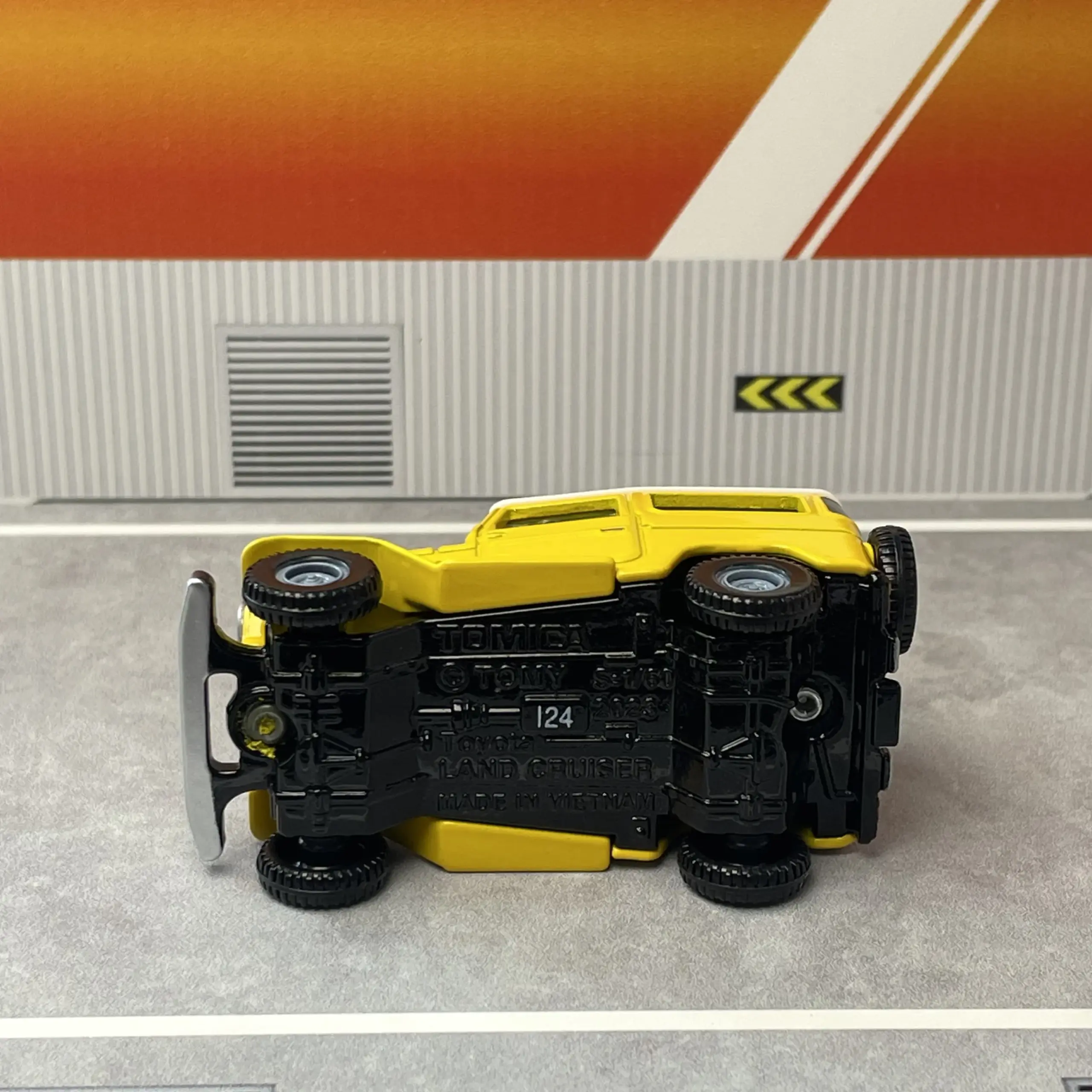 Experience the classic rugged style of the Toyota Land Cruiser with this Takara Tomy Tomica Premium 04 diecast model in 1:64 scale. Crafted from durable metal, this first edition TP-04 color variant features a bright yellow body contrasted by a white roof, realistic black side mirrors, textured rubber tires with detailed treads, and silver hubcaps. The front showcases a silver bumper and grille with horizontal bars, rectangular headlights, and subtle panel lines for added authenticity. Designed for collectors aged 14 and above, this model offers a minimalist interior visible through transparent windows, all originating from Vietnam and CE certified for quality.