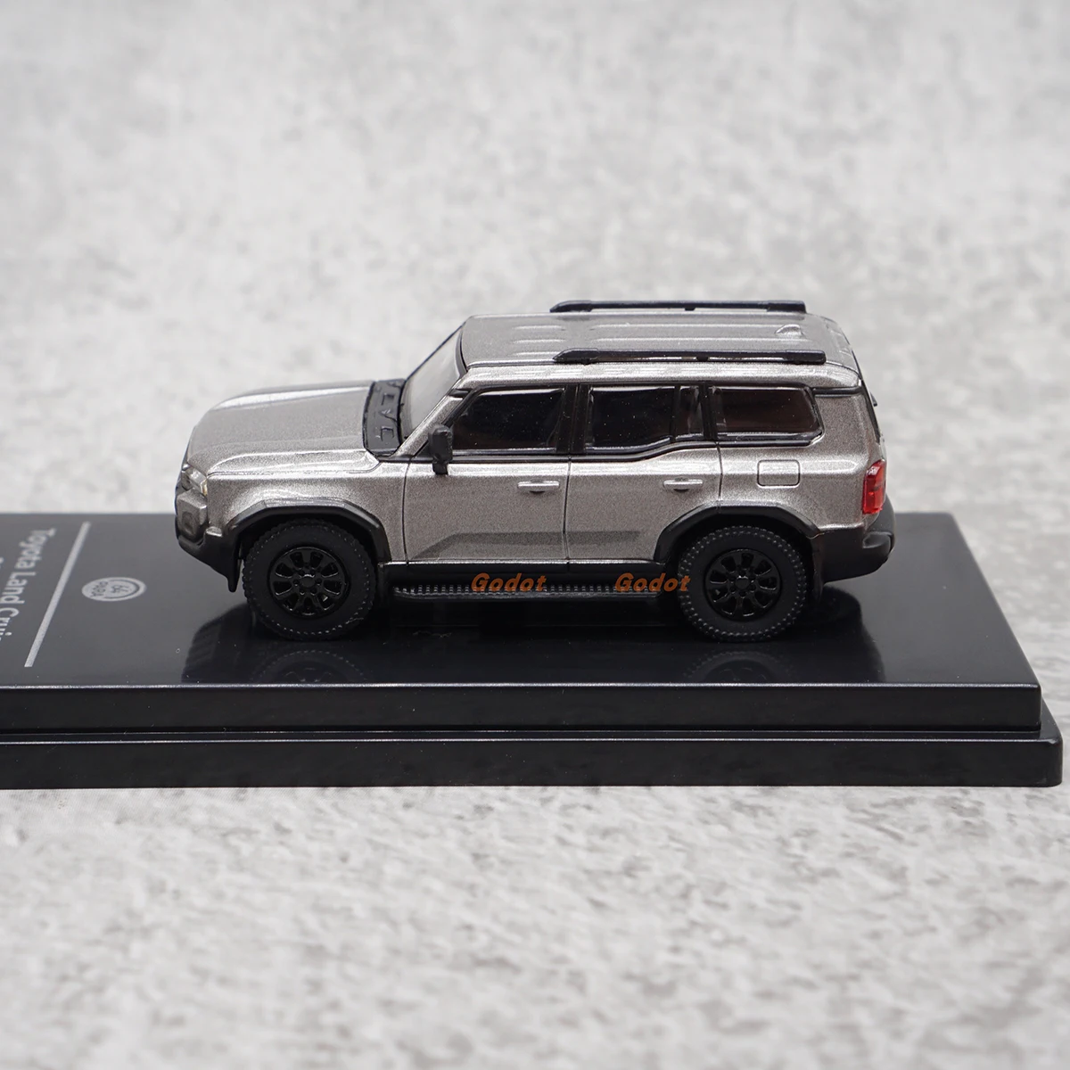 Imagine adding a touch of automotive excellence to your collection with this detailed scale model of the Toyota Land Cruiser LC250. Crafted from high-quality alloy and ABS plastic, this 1:64 scale diecast replica captures the iconic SUV’s robust and boxy design with a refined metallic finish. Its sleek silver color accentuates the vehicle’s realistic features, including black side mirrors, door handles, and window frames which contrast strikingly against the body. The model’s transparent windows reveal a simplified yet proportionate interior, complemented by subtle black roof rails. The textured tread tires and intricately designed multi-spoke rims provide an authentic, lifelike appearance. Ideal as a souvenir or a display piece, this model exudes craftsmanship and attention to detail, making it a must-have for enthusiasts.