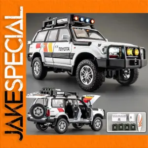 Experience the thrill of adventure with this stunning 1/24 scale diecast model of the Toyota Land Cruiser LC80. Dressed in a striking white body that features bold black accents and dynamic stripes in red, orange, and yellow, this model is designed to captivate any off-road enthusiast. Detailed craftsmanship brings this vehicle to life, boasting realistic sound and light simulations that enhance your visual experience. Open the slightly ajar doors to reveal the meticulously recreated interior, and imagine yourself behind the wheel of this legendary SUV. With a robust metal construction, this model is perfect for both play and display, allowing you to relish in its intricacy every day.