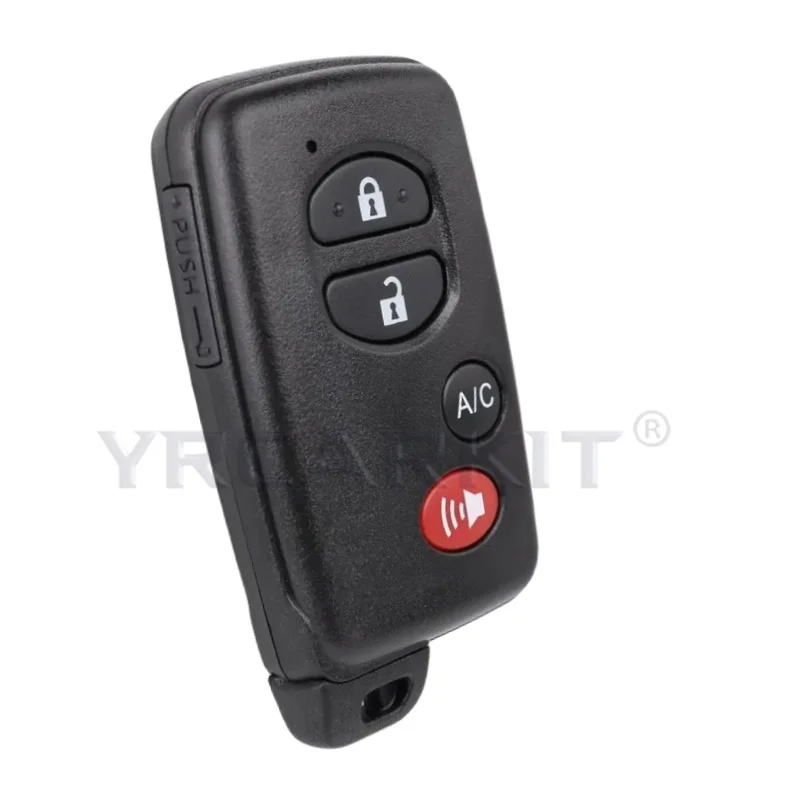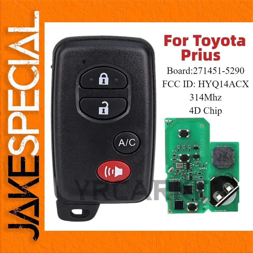 Enhance your Toyota Prius (2010-2015) with this sleek, black, keyless remote fob featuring a textured plastic exterior with smooth, rounded edges. It includes three functional buttons with simple, iconic symbols—locked, unlocked, and A/C—and a prominent red panic button with a white speaker icon for added safety. The compact design ensures a comfortable grip, while the internal circuit board operating at 314.3 MHz (FCC ID: HYQ14ACX, ID: 271451-5290) guarantees reliable transmission. Compatible with original keys sharing the same appearance, frequency, part number, and FCC ID, this remote needs to be cut and programmed locally for seamless integration.