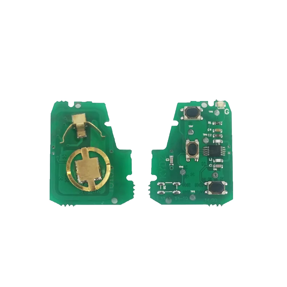 Picture yourself seamlessly unlocking your Toyota RAV4 or Highlander with this sleek remote car key. Crafted for models from 2013 to 2017, its black plastic head features three ergonomically arranged buttons: a prominent red panic button on top, with two smaller buttons for locking and unlocking below. The metallic key blade, designed for a perfect fit in your ignition, boasts a smooth connection to the head, ensuring durability. Inside, the green circuit board showcases essential electronic components, enhancing its functionality. This key keeps you connected to your vehicle, offering modern convenience with a classic touch.