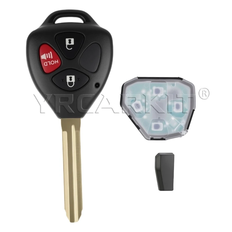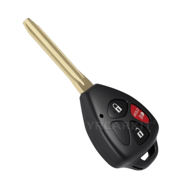Experience seamless control and modern design with this aftermarket remote car key, specially crafted for Toyota models like Yaris, Vitz, Hilux, and Scion TC XD. Its sleek, black plastic fob features a smooth, rounded triangular shape, making it comfortable to hold and easy to operate. The metallic gold-colored blade extends vertically, with grooves and notches adding a touch of precision craftsmanship. You'll appreciate the raised, flexible rubber buttons with white icons, providing tactile feedback for lock, unlock, trunk, and HOLD functions. Some versions include bold red accents for enhanced visibility. Transparent plastic covers securely protect the electronic components, revealing glimpses of the green circuit board inside. This key combines aesthetics with practicality, helping you keep your vehicle secure and accessible.