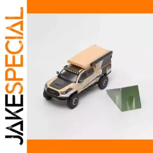 This 1:64 scale diecast model of a Toyota Tacoma pickup campervan offers exceptional craftsmanship with alloy construction and detailed design. Measuring approximately 7.5 cm long, 3.2 cm wide, and 2.8 cm high, it features a realistic beige and tan color scheme with decorative flame-like patterns, black accents on mirrors and windows, and a smoothly contoured camper top. The model includes finely molded headlights, grille, and silver hubcap wheels with black tires, making it perfect for display and collection. Intended for ages 14 and above, this fragile, non-electronic miniature showcases high-quality craftsmanship suitable for adult enthusiasts.