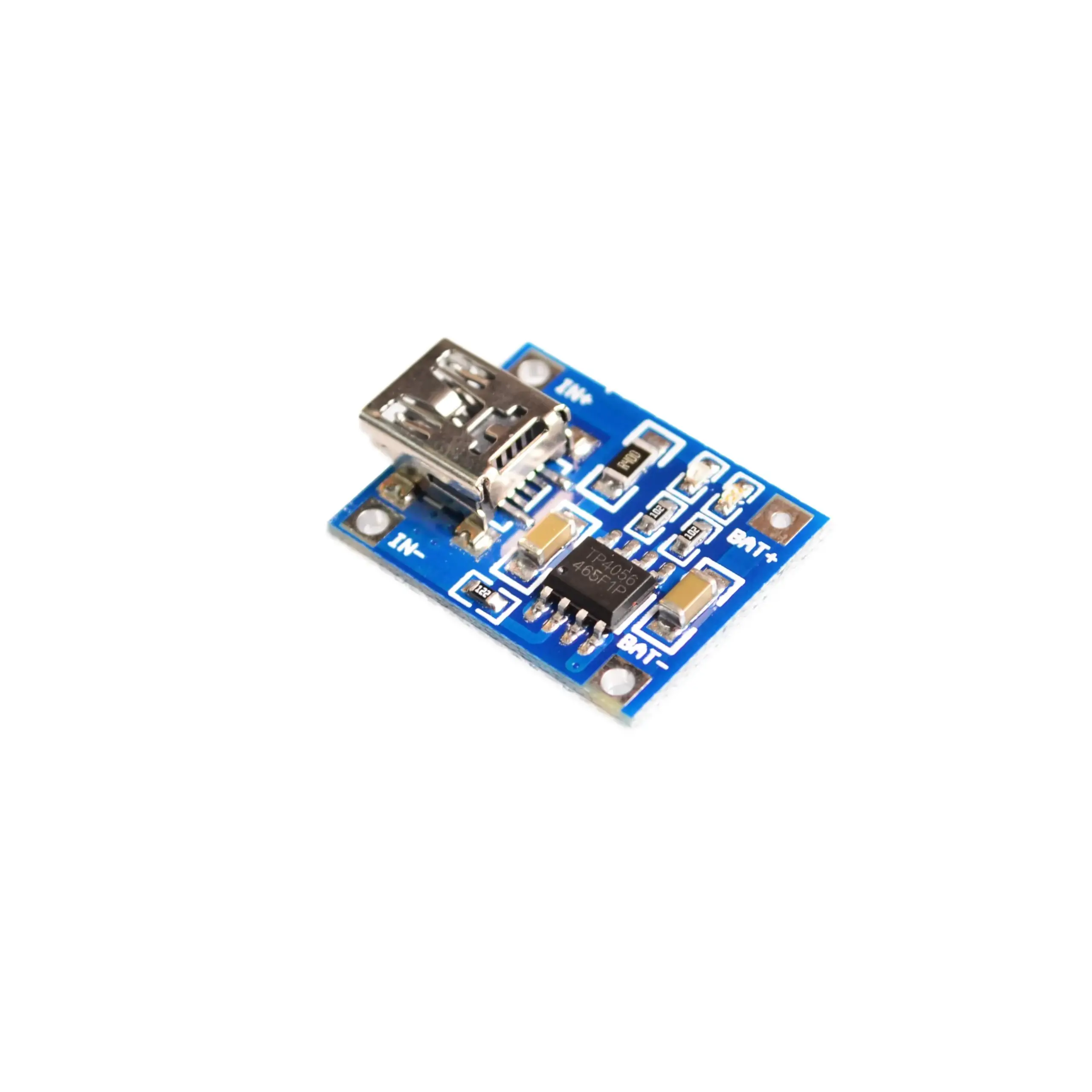 Experience seamless lithium battery charging with this sleek and compact TP4056 module. Designed for DIY electronics enthusiasts, this charger board features a vibrant blue PCB with a minimalist and highly organized layout. The silver mini USB port adds a modern metallic touch, contrasting elegantly against the matte blue surface. White silkscreen labels clearly mark input and output pins, enhancing the streamlined, high-tech aesthetic. With an adjustable current up to 1A and a charge precision of 1.5%, this module allows precise control for your projects. The integrated LED indicators—red for charging and blue for full charge—provide easy monitoring, ensuring safe and reliable battery management. Its versatile design suits microcontroller applications and battery management systems perfectly.