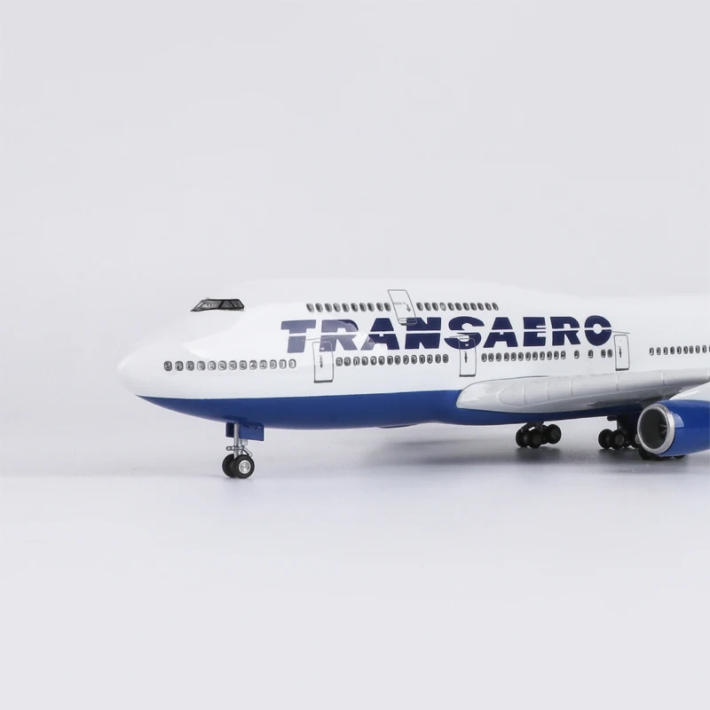Imagine owning this exquisite 1/150 scale replica of the Transaero Airlines Boeing 747. Crafted from resin with a smooth, polished finish, this model showcases realistic details including the airline’s bold blue accents, a streamlined fuselage, and precisely modeled engine pods. The landing gear adds a dynamic touch, making it perfect for display in a professional collection. Available in versions with or without voice-controlled lights, it creates an engaging visual experience. The model's elegant design and fine craftsmanship evoke a sense of sophistication and realism, ideal for aviation enthusiasts and collectors. It’s a wonderful piece that captures the spirit and style of the iconic 747, ready to elevate your display at home or in an office.