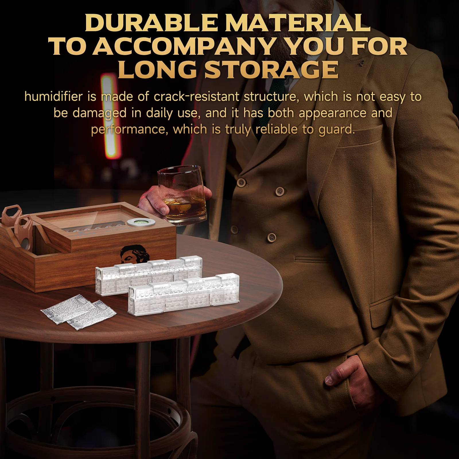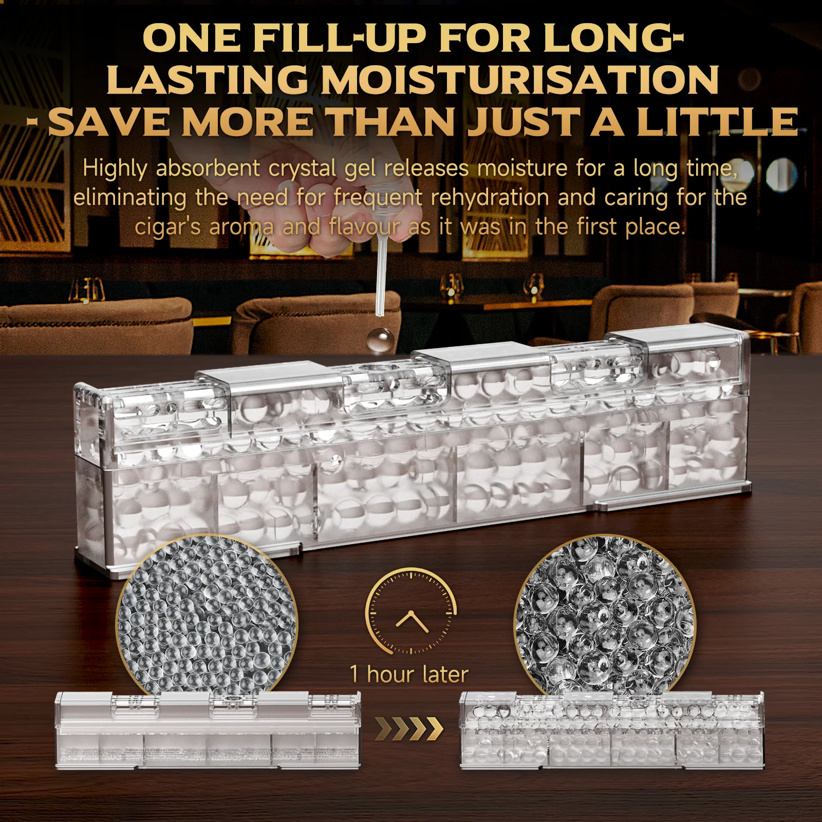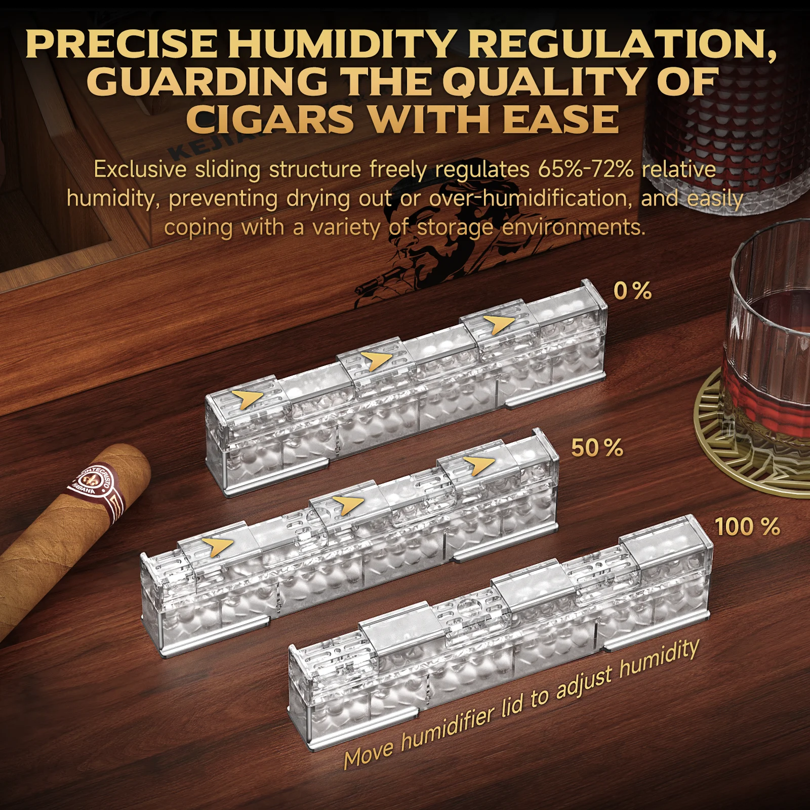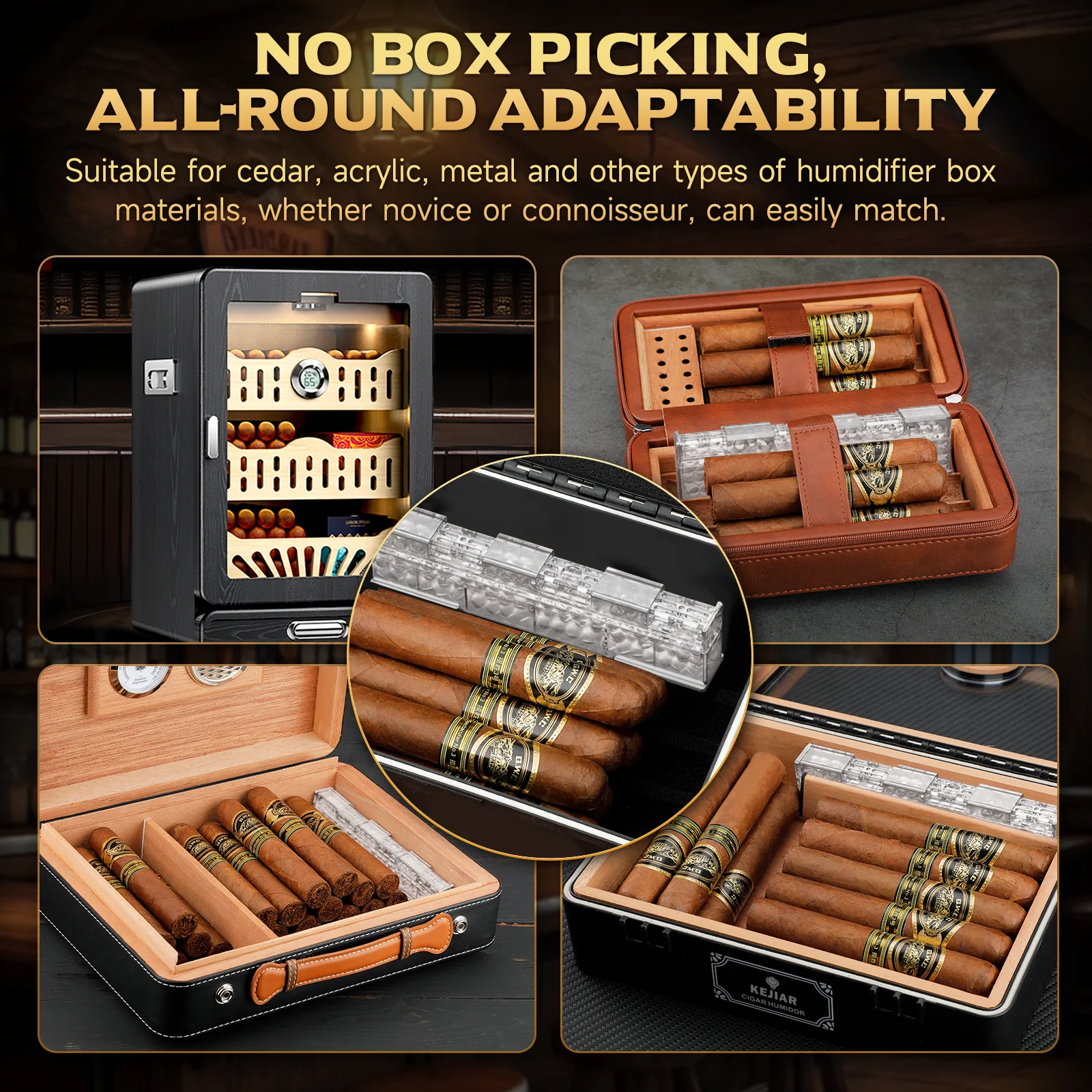 Experience precise humidity control with this 2-piece slide-controlled cigar humidifier, measuring 5.92″ in length, 0.78″ in width, and 1.37″ in height. Available in transparent or black, it features high-capacity crystal gel for moisture retention over several weeks and operates quietly with a simple sliding mechanism to maintain 65-72% relative humidity. Compatible with all cigar humidors crafted from cedar, acrylic, or metal, it requires no tools or adhesives for effortless installation. Made from non-toxic, odorless metal, its sleek bar or rectangular shape seamlessly blends into any storage environment, ensuring your cherished cigars stay fresh, flavorful, and perfectly humidified.