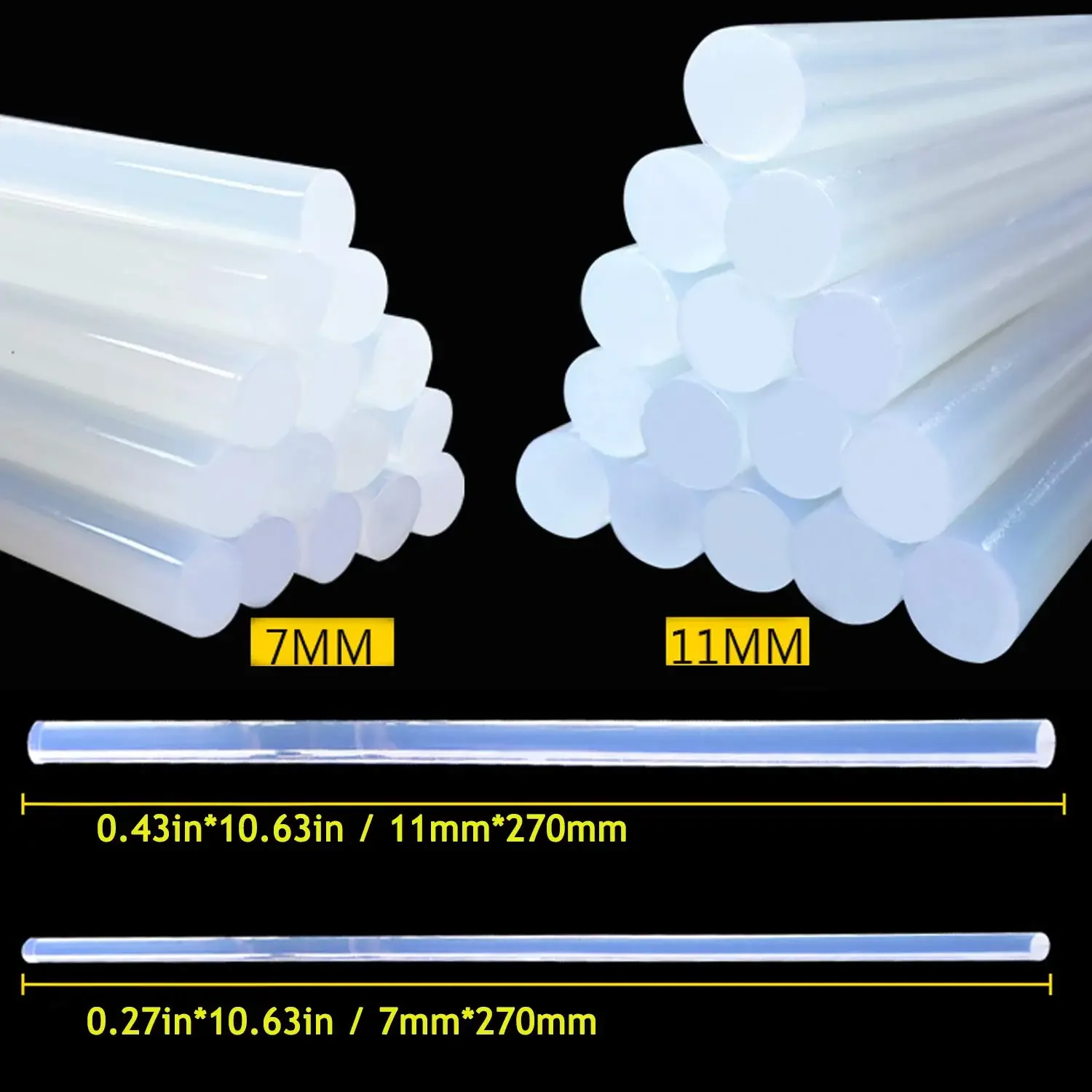 - These clear, cylindrical glue sticks are 7mm in diameter and 100mm long, offering easy handling and precise application in various projects and repairs.
