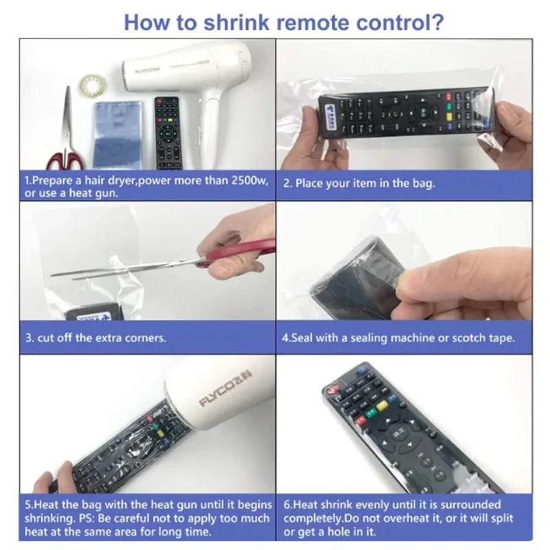 - Easy to attach and remove, these shrink film bags can be heated with a regular hairdryer, forming a tight, smooth, protective covering that enhances device longevity and cleanliness.