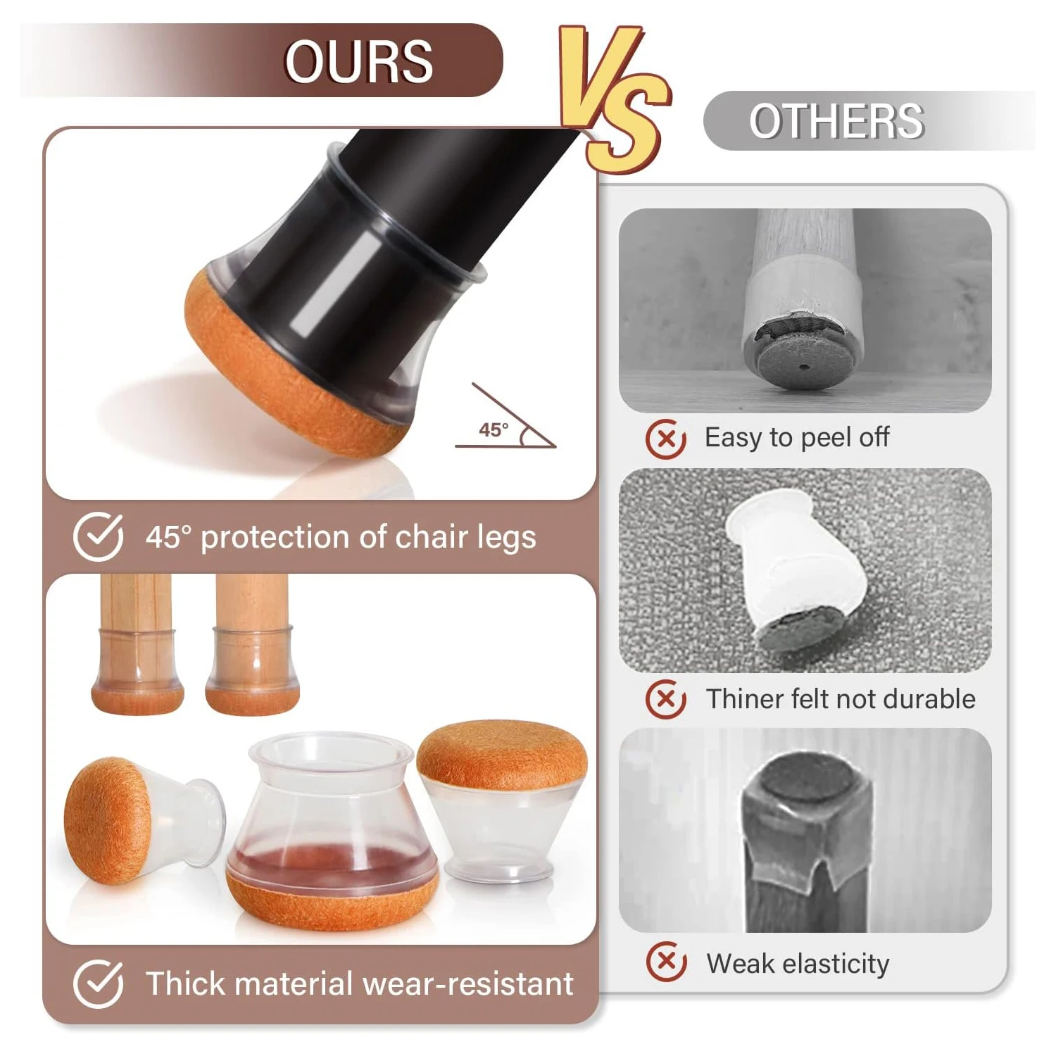 Transform your home with these transparent, easy-to-install chair leg protectors. Protect your hardwood floors from scratches and noise effortlessly, maintaining your space’s beauty and tranquility. You'll enjoy smoother, quieter chair movements, and cleaner-looking furniture with minimal effort. Whether you need protection for a few chairs or a complete set, these protectors adapt perfectly to your needs. Make a smart investment in your flooring and furniture today, and experience the hassle-free, long-lasting benefits of these sleek protectors designed to enhance your living space’s style and durability.