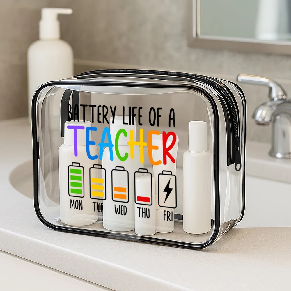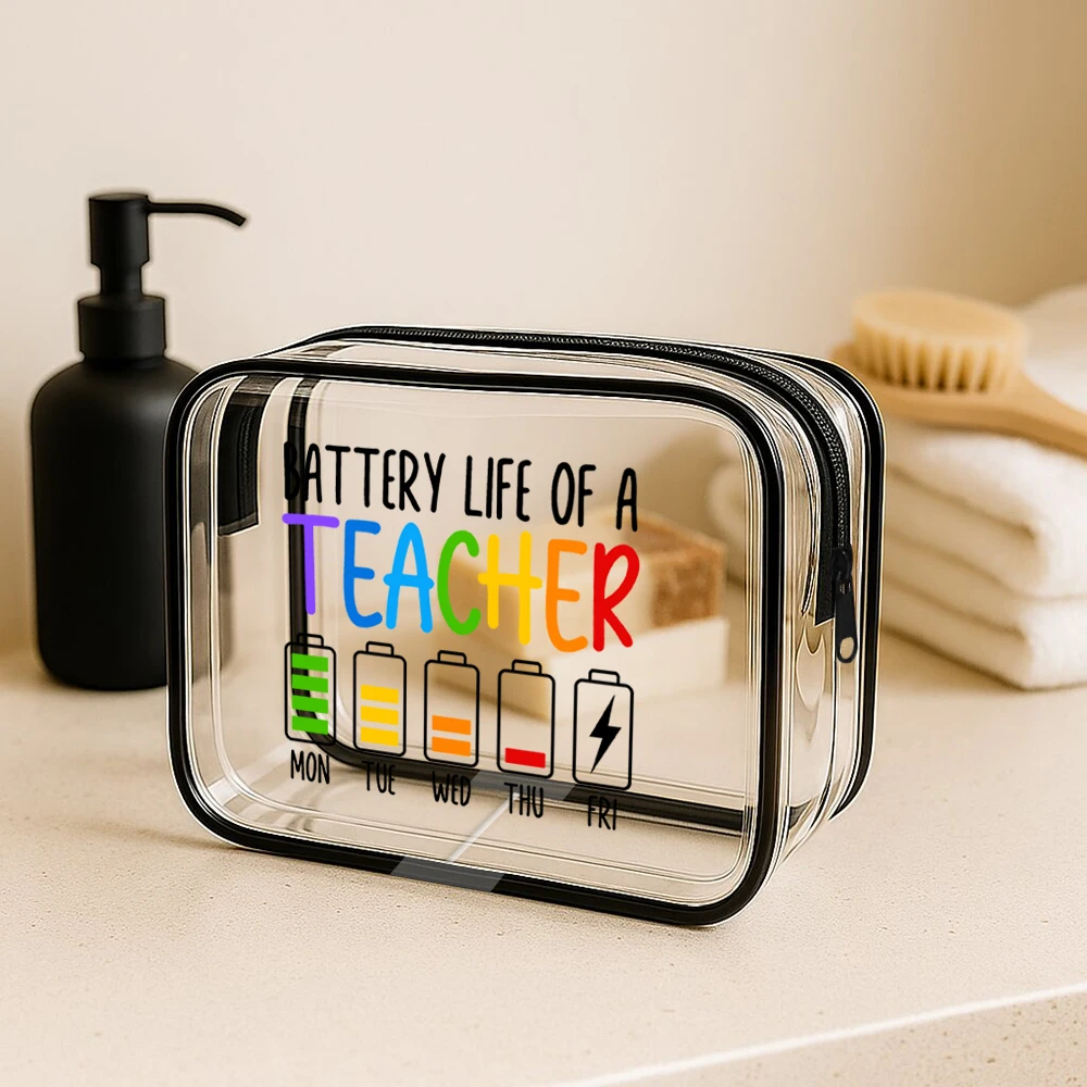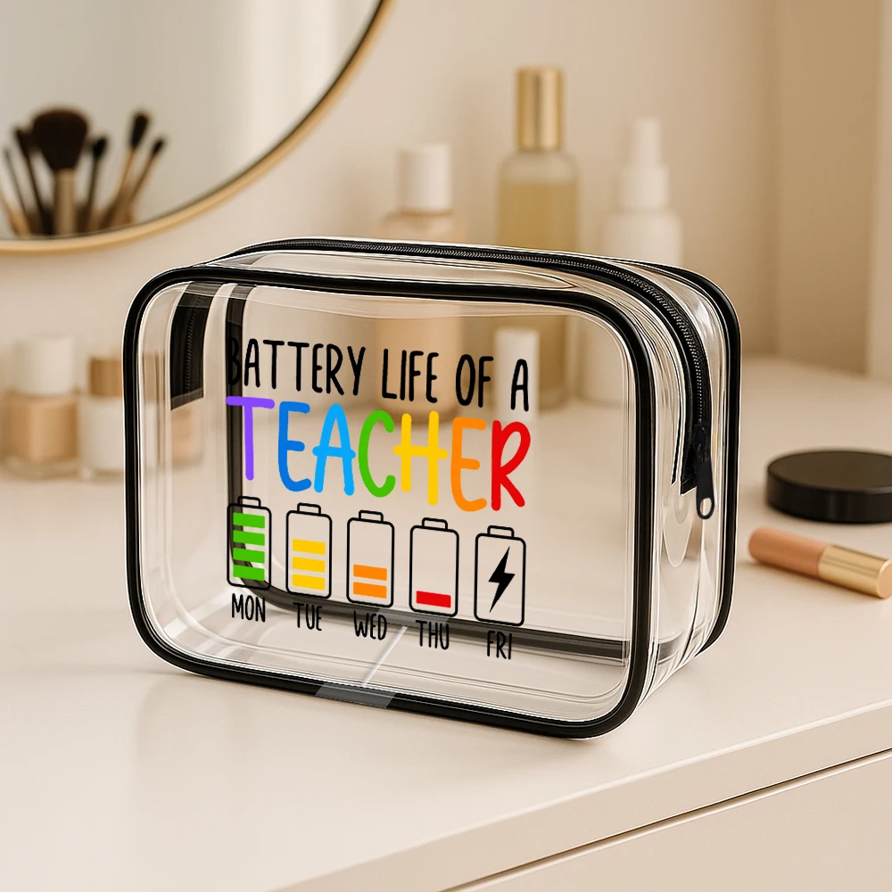 Step into your day with this stylish and practical clear cosmetic bag, designed to keep your toiletries and makeup organized effortlessly. Made from durable PVC, it provides full visibility, so you always know what's inside without rummaging. The eye-catching printed phrase “Teacher battery life” adorns the smaller bag, featuring colorful battery icons representing weekdays, with each letter of “TEACHER” in bold, bright hues—purple, blue, yellow, orange, and red—adding a lively touch. Both sizes, large and small, feature sleek black zippers for easy access and a modern aesthetic. Whether for travel or daily use, this bag combines functionality with cheerful style, making it your perfect companion for busy mornings or adventures abroad.