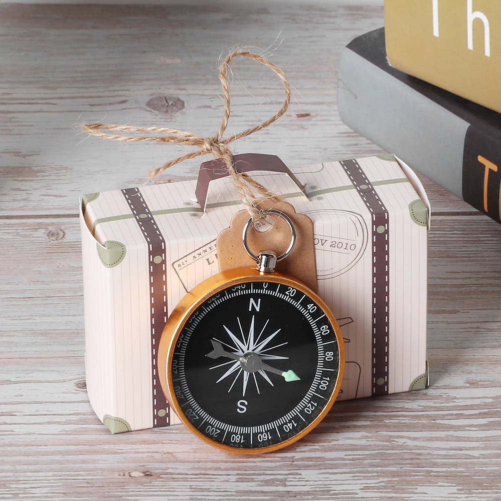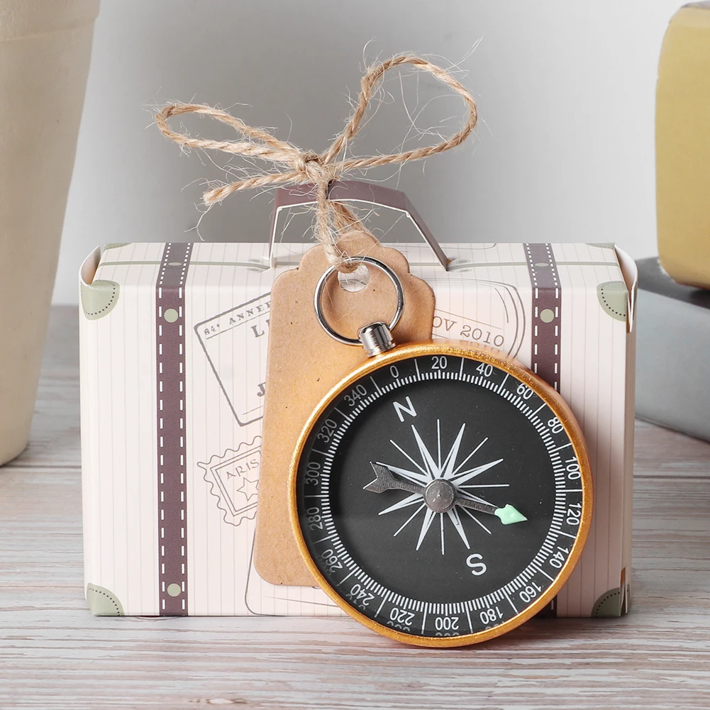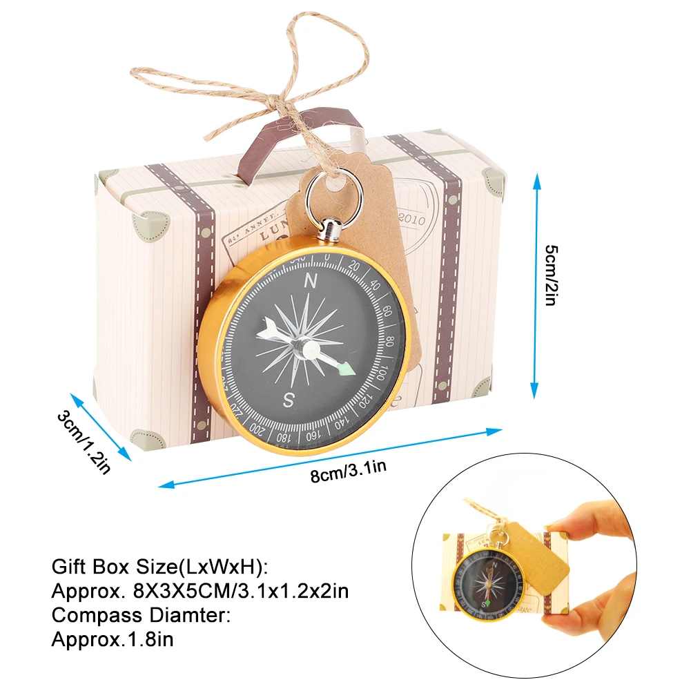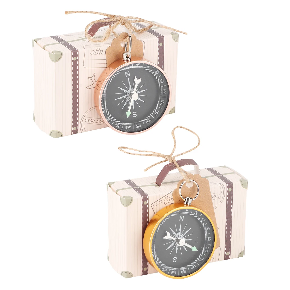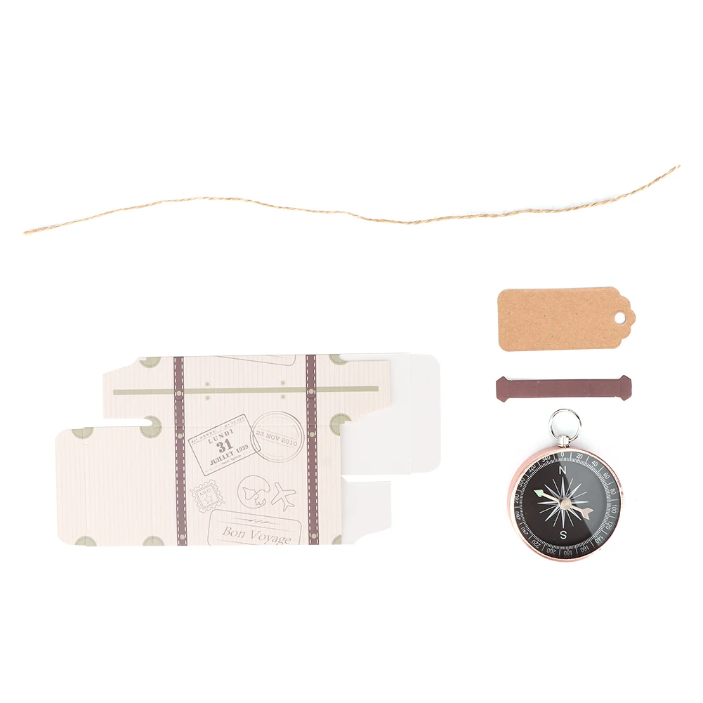 Imagine yourself hosting a wedding or special event where guests are delighted by thoughtful, vintage-inspired favors. This beautiful set features small, rectangular gift boxes with a charming travel motif, crafted from sturdy paper with a pastel palette. Each box measures approximately 8 x 3 x 5 cm and is designed with a handle, making it easy to carry and display. Accompanying these are sleek, 1.8-inch diameter, 360° rotatable compasses in stunning gold or rose gold aluminum alloy, perfect for outdoor navigation or as decorative accents. The set includes blank kraft tags and natural hemp cords tied into delicate bows, allowing you to personalize each gift. Envision these elegant elements combined to create a memorable, travel-inspired favor that your guests will cherish.