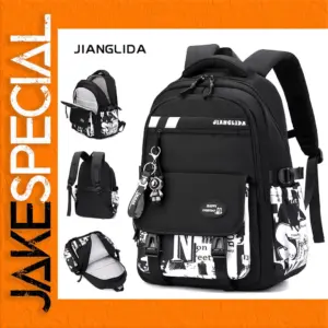This fashionable backpack is designed with the needs of teenagers in mind, blending style and practicality seamlessly. The primarily black exterior is complemented by a striking black and white pattern on the lower part, featuring letters and graphics that enhance its modern, street-trend aesthetic. Made from durable, waterproof nylon, it ensures that your school essentials stay safe and dry in any weather. With a spacious capacity ranging from 20 to 35 liters, this backpack is perfect for carrying books, supplies, and even a computer up to 16″ in size. Enjoy the comfort of padded straps and a soft handle, making daily use a breeze.