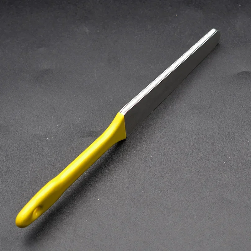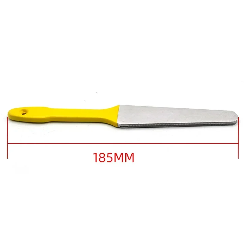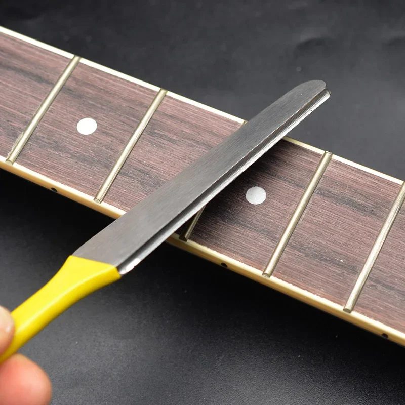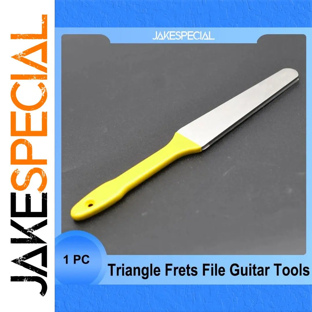 The Triangle Frets File is an essential tool for guitar repair, constructed from durable stainless steel and featuring a dual cutting edge for precise fret crowning. With a total length of 185mm (approximately 7.3″), it has identical sizes on both edges and a long filing surface for efficiency. The vibrant yellow rubber handle offers ergonomic comfort and includes a storage hole, ensuring ease of use during maintenance tasks. Its striking yellow and silver color scheme makes it not only functional but also visually appealing, making it a perfect gift for guitar enthusiasts.