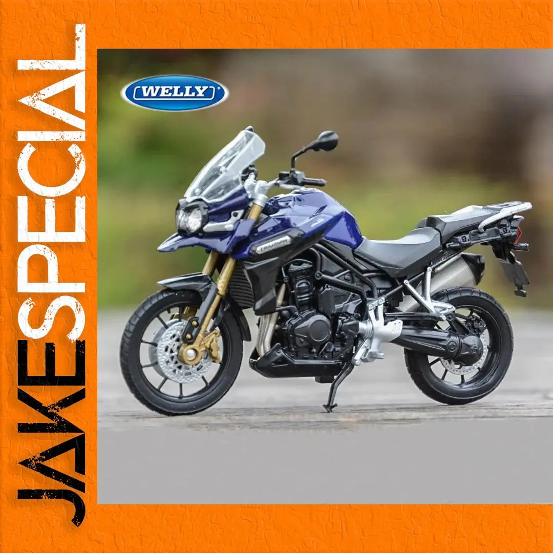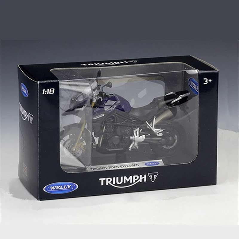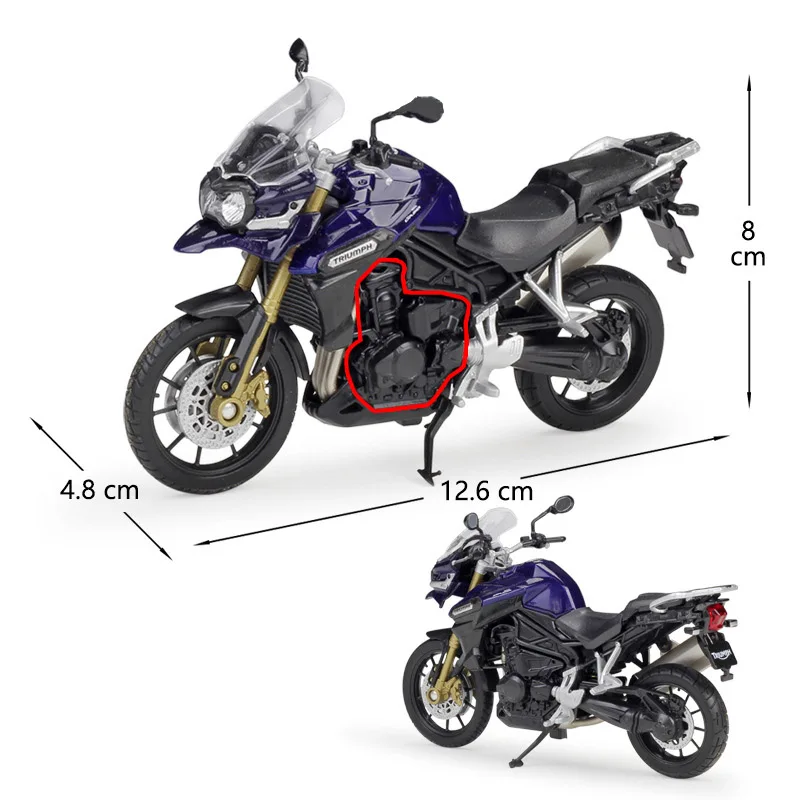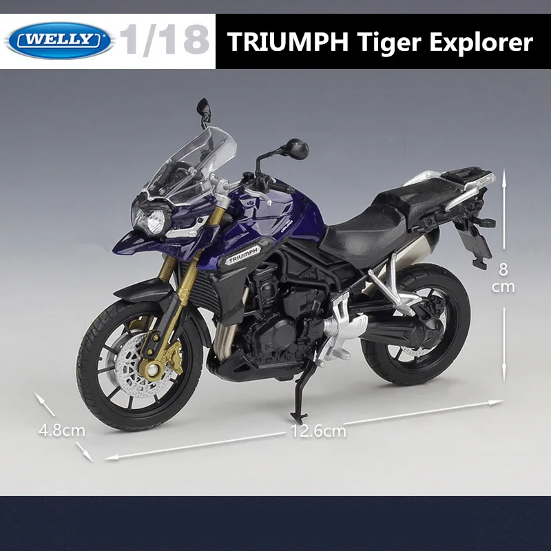 Experience the thrill of street racing with this detailed 1:18 scale diecast model of a Triumph Tiger Explorer motorcycle, crafted from durable alloy and plastic. Featuring a glossy blue finish, intricate fairings, twin headlights, a clear windshield, black rearview mirrors, and textured tires with visible tread patterns, this model captures the essence of high-performance riding. Golden-colored fork tubes contrast seamlessly with multi-spoked wheels, and the black ergonomic seat with a rear luggage rack adds functional detail. Suitable for collectors and enthusiasts aged 4 and up, it makes an impressive display piece or a realistic collectible for motorcycle lovers.