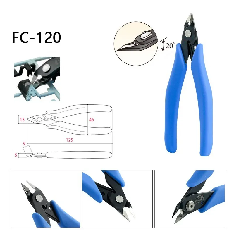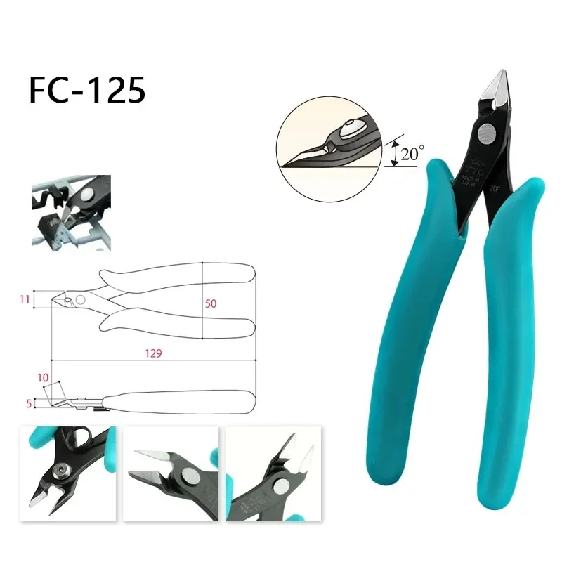 - Technical specifications include models FC-120 (120mm length) and FC-125 (125mm length), with each designed for cutting copper wire and other small metal components.