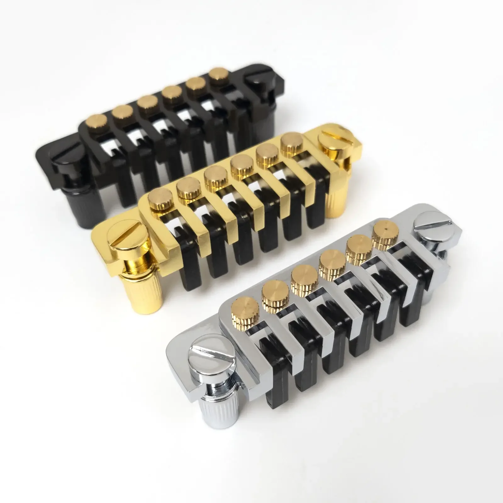 Experience improved tone clarity and tuning stability with this this high-quality, durable tailpiece designed for six-string electric guitars. Crafted from zinc alloy, it features a sleek, polished finish available in gold, chrome, black, bronze, or chameleon rainbow, adding aesthetic appeal. Its rectangular, flat profile with smooth rounded edges showcases refined craftsmanship, perfect for instrument upgrades or replacements. The evenly spaced knurled knobs on the top surface allow precise height adjustments, helping to optimize string tension and reduce breakage. With a saddle post spacing of 51.5mm and string spacing of 10.3mm, it’s compatible with popular models like Gibson Les Paul, SG, and Epiphone. Easy to install, it’s ideal to enhance your guitar’s performance and aesthetic.