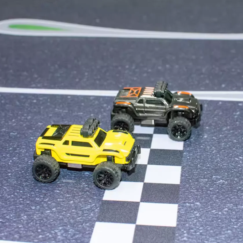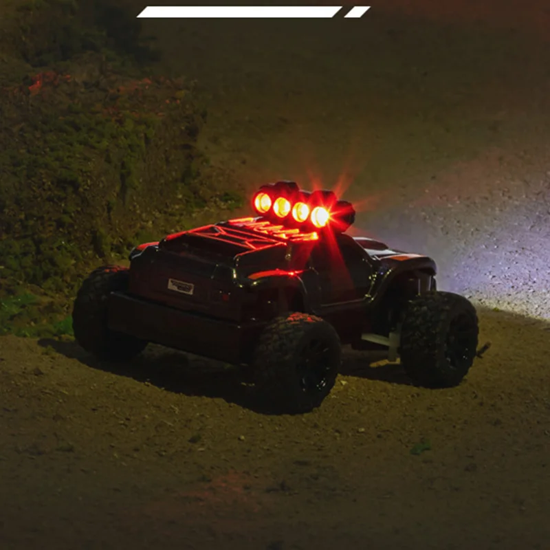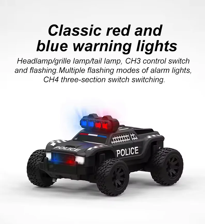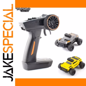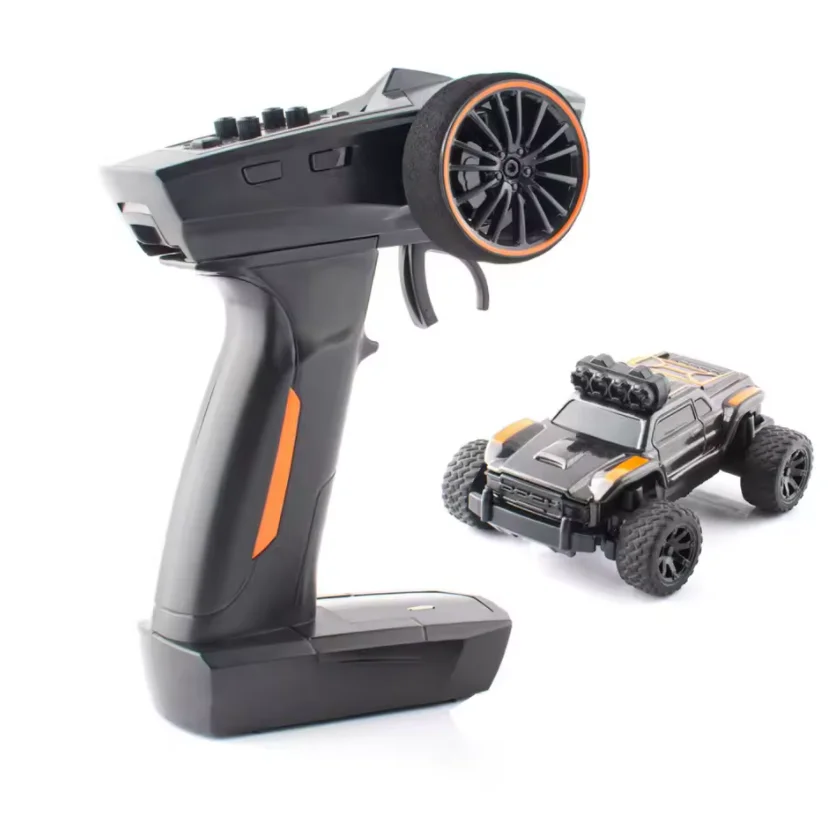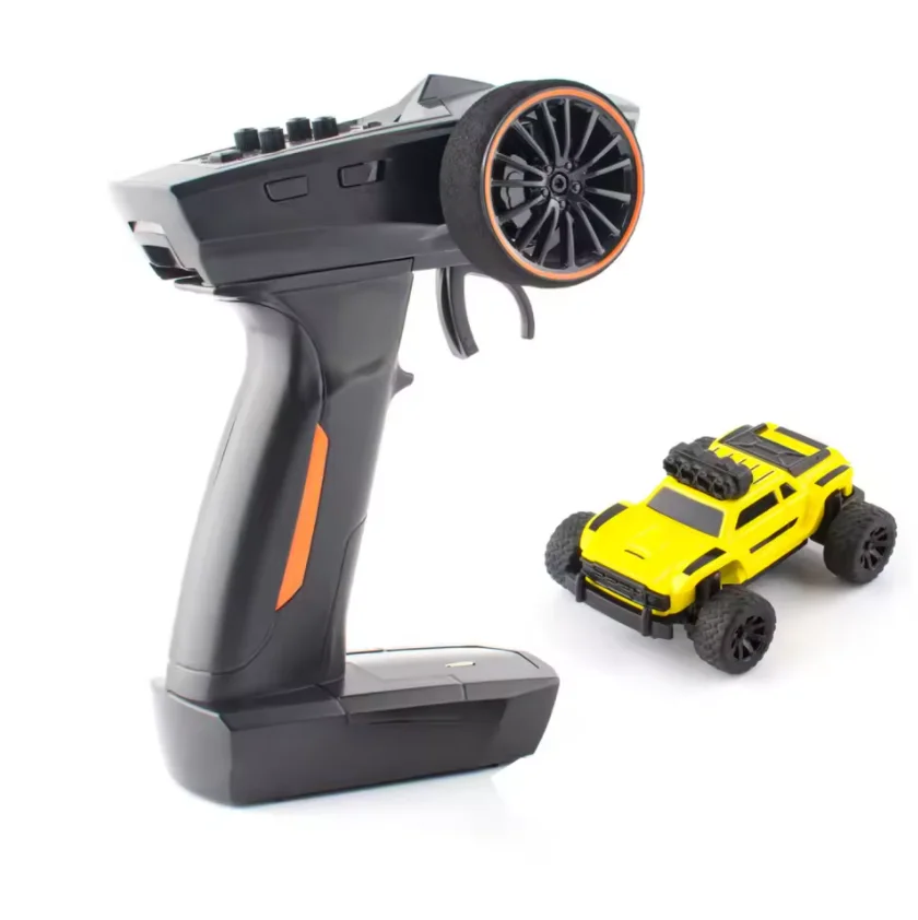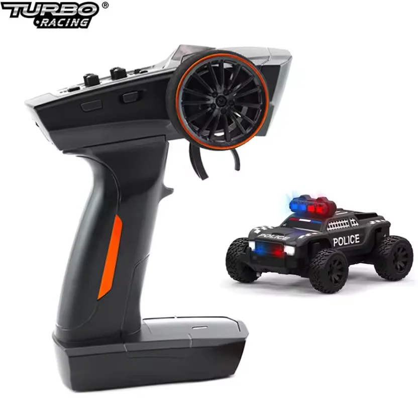 Experience thrilling off-road action with the Turbo Racing 1:76 RC truck, featuring a sleek matte black body with orange accents, detailed grille, headlights, and LED lights for realistic lighting effects. It has a 50mm length, 23mm width, and 19mm height, weighing 450g, with chunky black wheels and visible suspension for durability. The vehicle is powered by a 40mAh LiPo battery offering up to 30 minutes of playtime, charged via Type-C in 30 minutes. Operating on 2.4GHz with a control distance of 30 meters, it includes a remote control with a pistol grip, multiple control channels, trim, and reverse steering functions. Available in black, yellow, and police car color options.