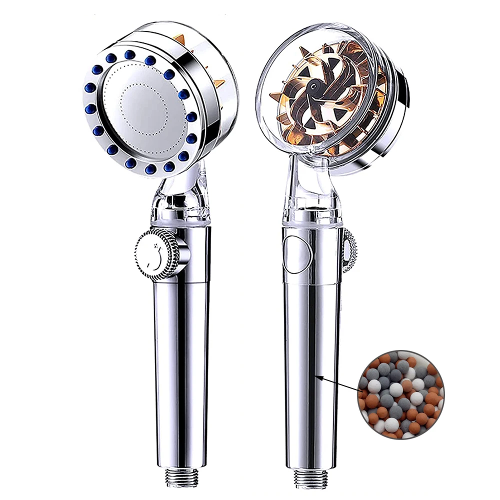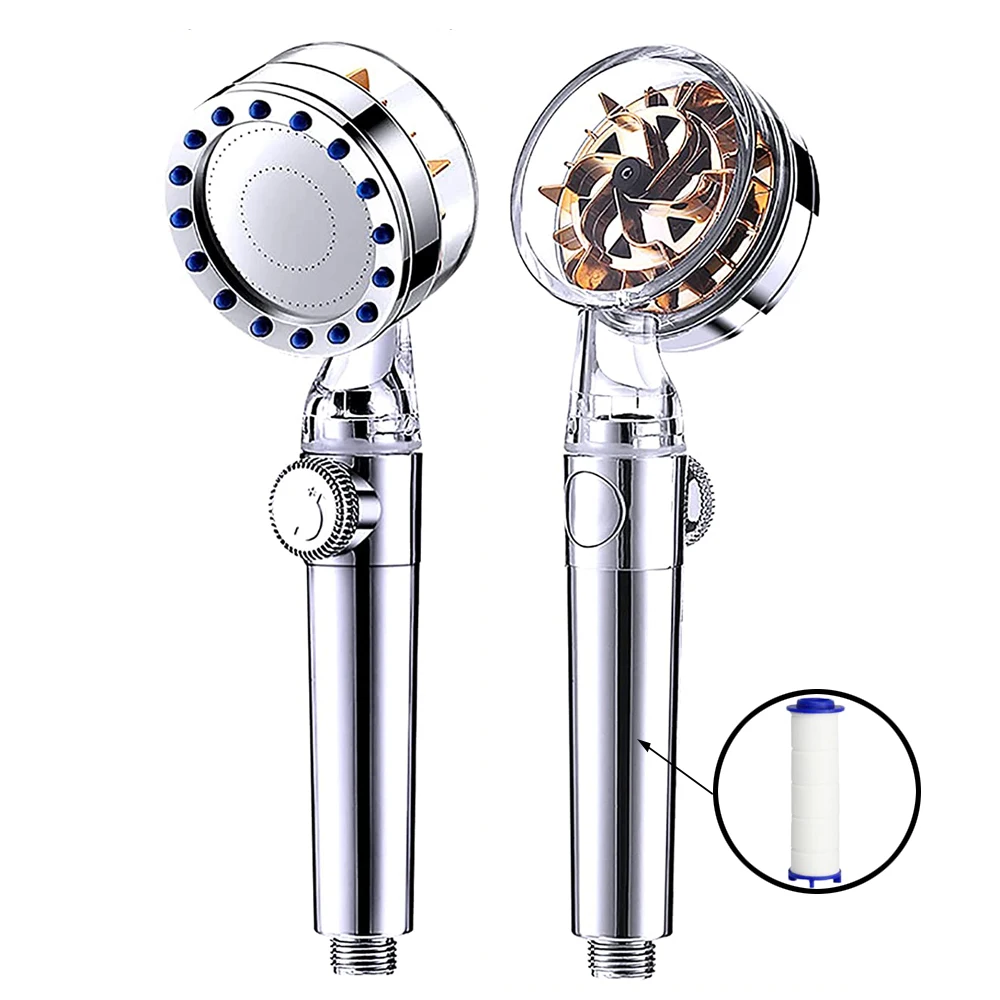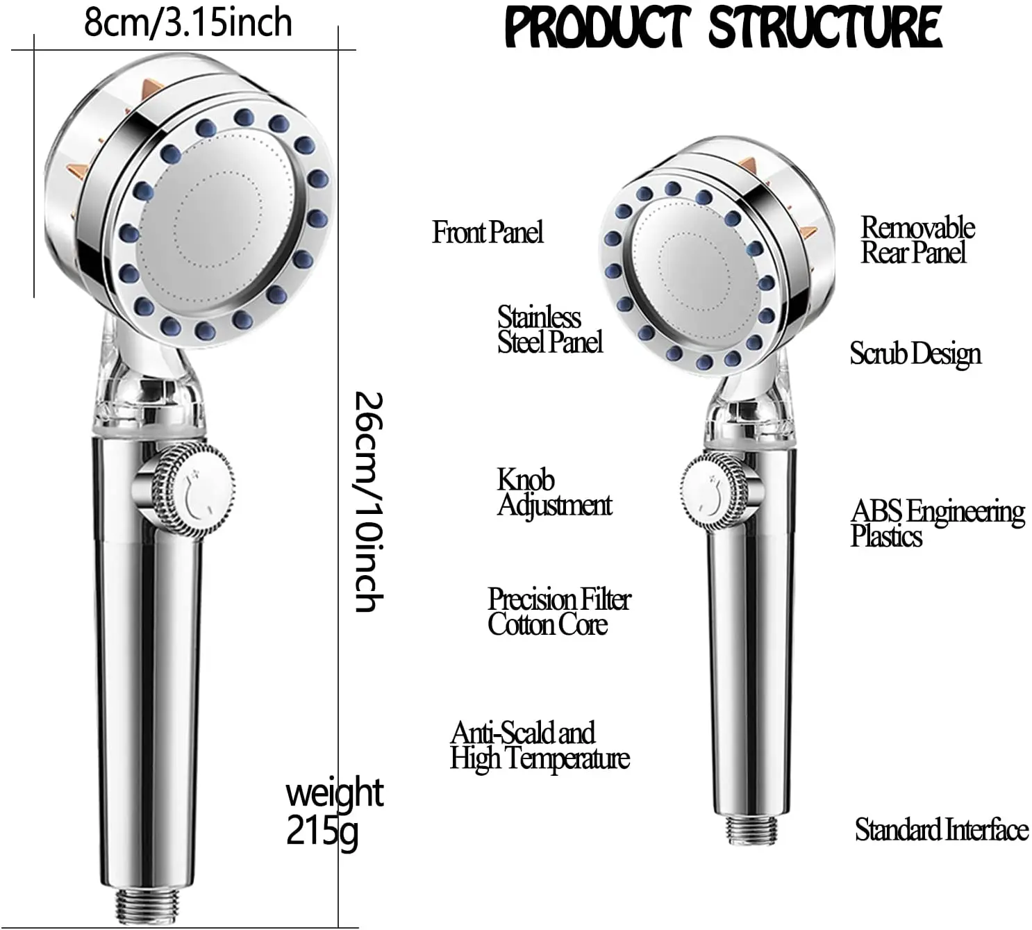 Experience the luxurious feel of this upgraded turbo shower head, designed to elevate your daily shower routine. Its modern round shape combines high-quality ABS plastic with a stainless steel panel, finished with multi-layer crystal chrome plating for a shiny, polished look. The built-in turbo fan dramatically enhances water pressure, delivering powerful, pressurized spray for a refreshing shower experience. Its water-saving feature reduces consumption by over 50%, making it eco-friendly and cost-efficient. The removable, filter system includes high-density cotton filters and precision filters to intercept sediments, impurities, and rust, ensuring clean, healthy water. Easy to install without tools, this shower head offers multiple spray modes and an adjustable pressure function, perfectly blending form and function for a rejuvenating shower experience.