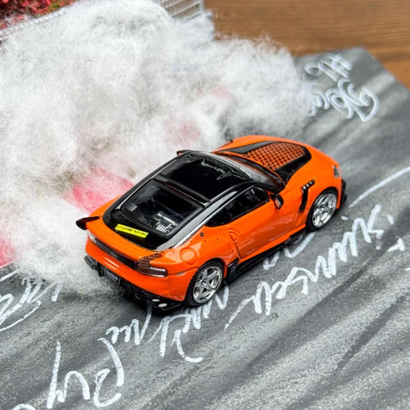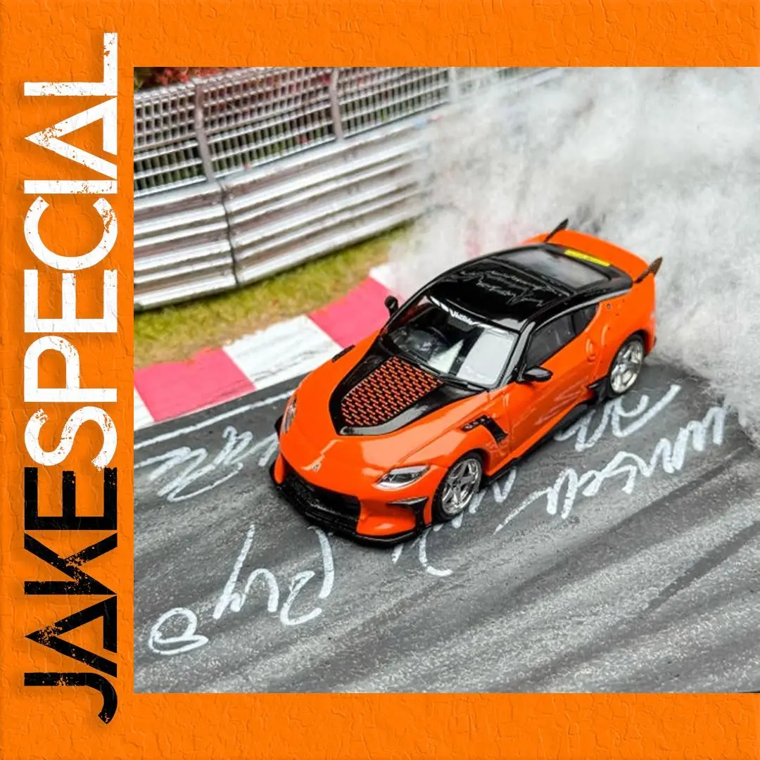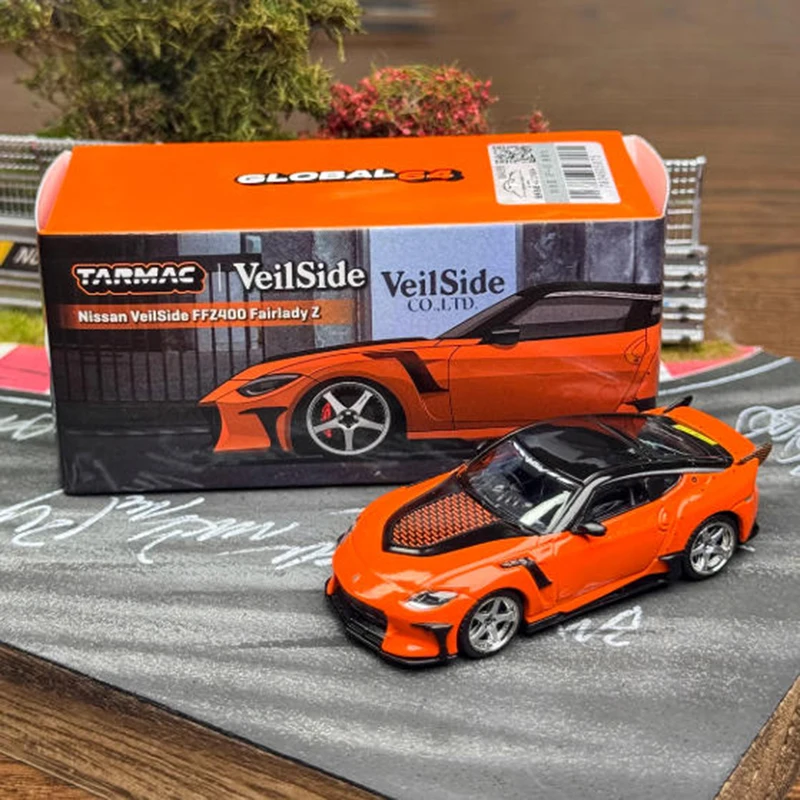 The TW 1:64 VeilSide FFZ400 Fairlady Z Alloy Car Model showcases a striking vibrant orange finish with bold black accents, featuring an eye-catching honeycomb pattern on the hood and a sleek black roof. With a scale of 1:64, the model boasts an aerodynamic design characterized by prominent fender flares, a wide front grille, and sharp headlights that exude a racing aesthetic. The silver wheels display intricate multi-spoke detailing, enhancing realism, while the smooth glossy finish amplifies its vibrant colors. This static model is perfect for collectors and serves as an impressive decorative piece or gift. Made from alloys and plastics, it requires no batteries for display.
