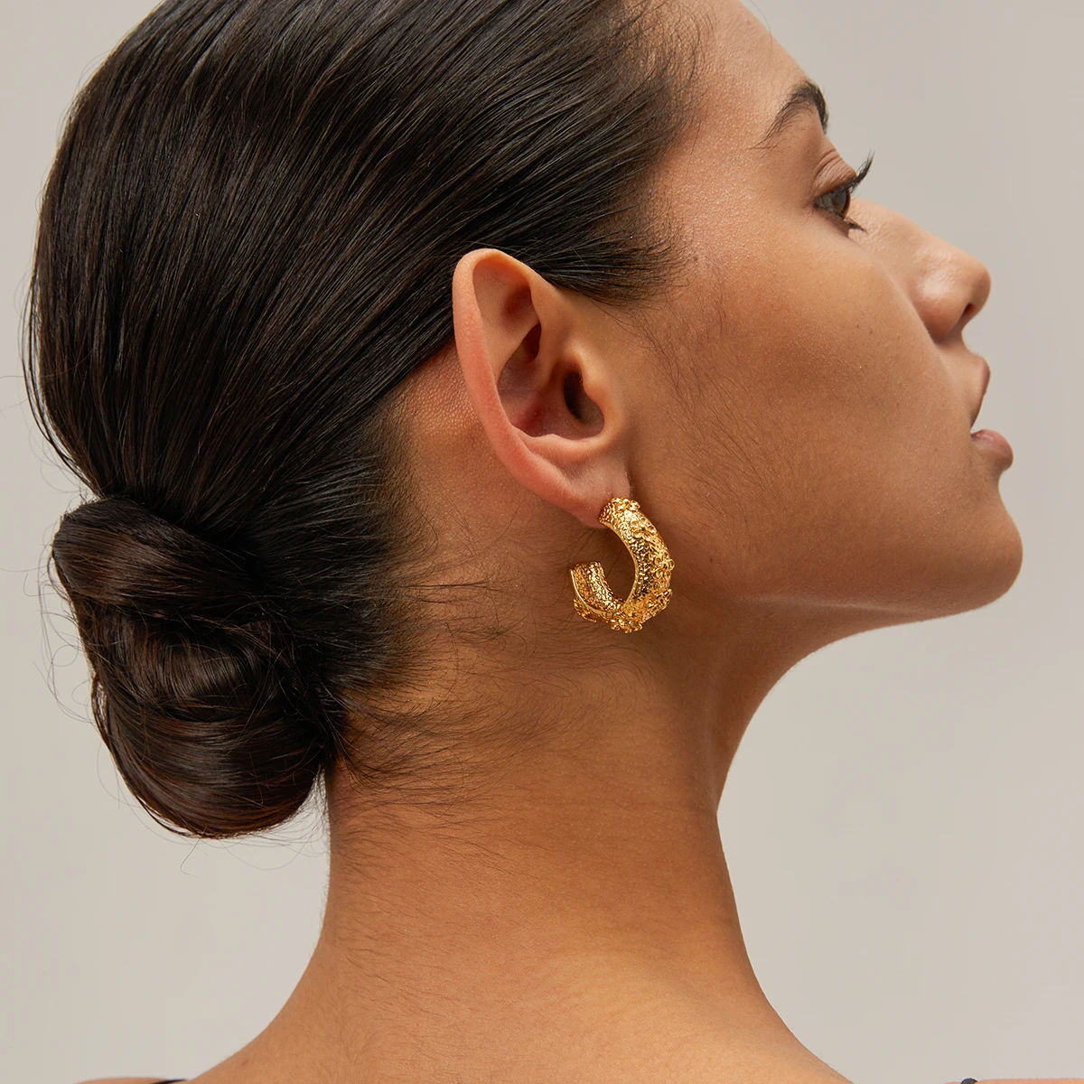 - Bold, medium-sized hoops with a rounded crescent shape and a textured, uneven surface for a modern aesthetic that stands out and complements different fashion looks.