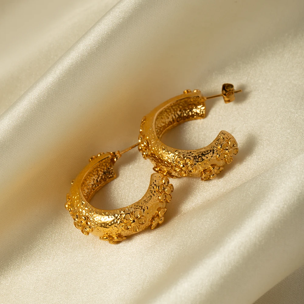 - Intricately decorated with tiny floral embellishments evenly distributed around the hoops, adding a delicate, ornate touch to the contemporary design.