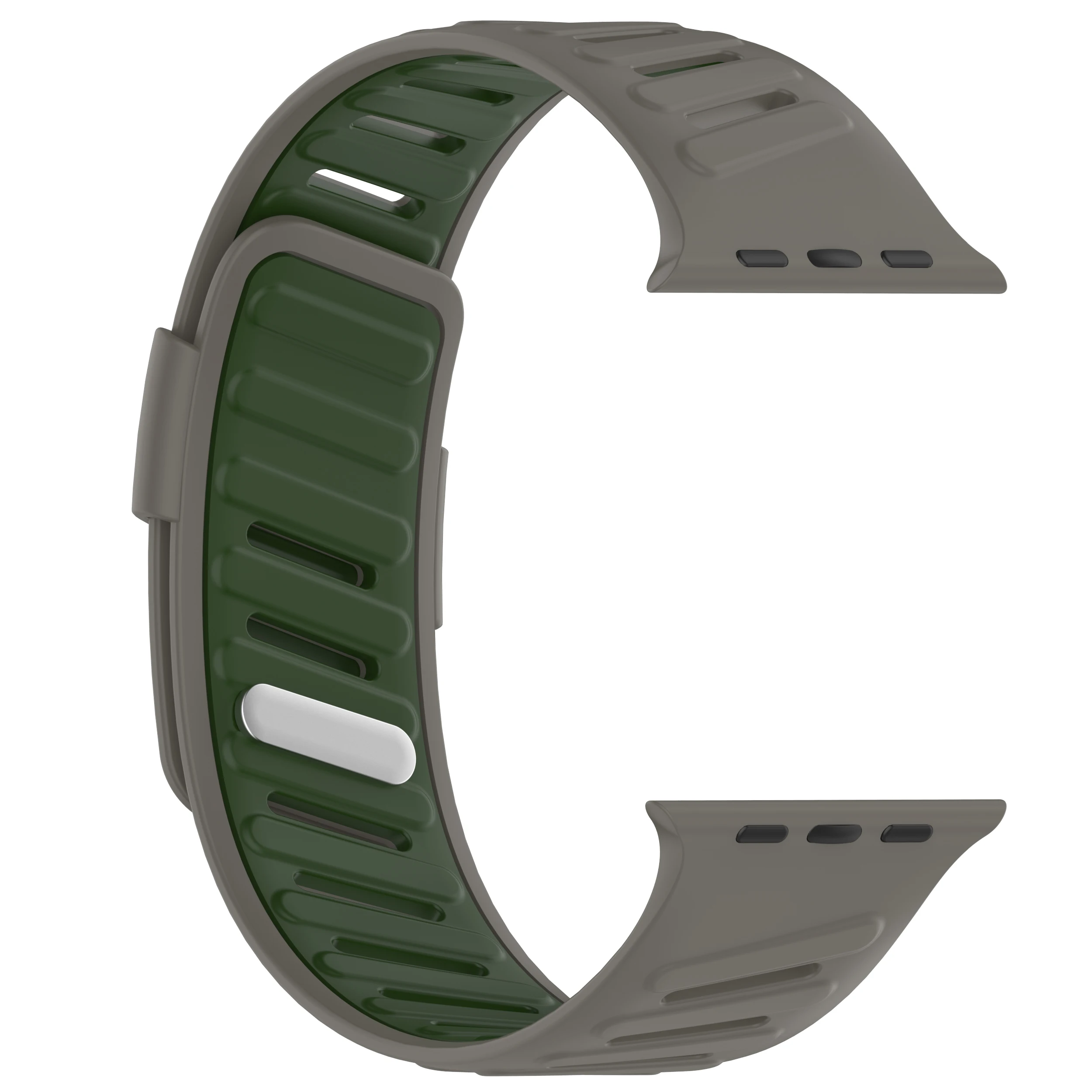 Imagine yourself confidently wearing this vibrant, two-tone silicone sport strap on your Apple Watch Series 7, 8, 9, or 10, including Ultra models. Its sleek design combines durability and breathability, ensuring comfort during all-day wear or intense sports sessions. The soft silicone feels gentle against your skin, while the textured, elongated indentations promote ventilation. The contrasting colors—ranging from classic neutrals to bold hues—add a personalized touch to your device. With an adjustable clasp, this band provides a snug, secure fit that moves perfectly with your active lifestyle. Enhance the look and feel of your Apple Watch, making it your perfect fitness companion while showcasing your unique style.