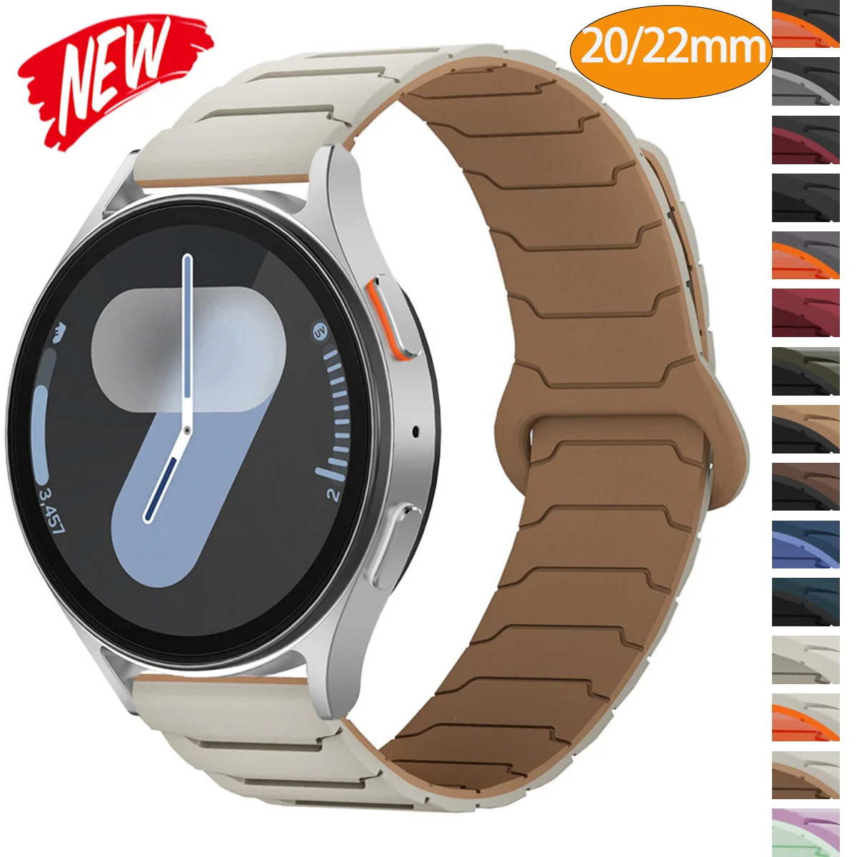 Enhance your smartwatch with this stylish, durable silicone strap featuring a two-tone magnetic design. Available in 20mm and 22mm widths, it offers a perfect fit for a wide range of devices including Samsung Galaxy Watch series (40mm, 44mm, 46mm, 43mm, 47mm), Huawei Watch GT series, Amazfit Bip/BipU Pro, Xiaomi Watch, Garmin Venu Sq, Vivo Move HR, Ticwatch Pro, Realme Watch 2 Pro, Haylou RS4, RS4 Plus, RS5, LS02, Solar RT2, and Solar GS. Made from high-quality silicone, this strap provides comfort, flexibility, and a modern aesthetic with various color options such as AGrB, B, BH, BO, BWR, ChocoB, DLNU, HO, LaLMG, MidB, MilkTeaB, Star, StarMilkTea, StarO, and WR. Perfect for upgrading your watch style.