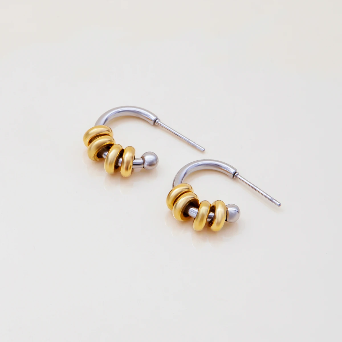 Experience the perfect blend of simplicity and sophistication with these minimalist two-tone stainless steel earrings. Featuring a sleek, circular C-shape design, they combine a luminous PVD gold color with a polished platinum finish for an eye-catching contrast. Their clean lines and polished surface effortlessly reflect light, adding a subtle sparkle to your daily look. Designed for versatility, these stud earrings are suitable for any occasion, offering a comfortable screw-back fastening that ensures they stay securely in place. Crafted from high-quality stainless steel, they are hypoallergenic and durable, making them suitable for sensitive skin. Whether you're dressing up or down, these earrings elevate your style with understated elegance.