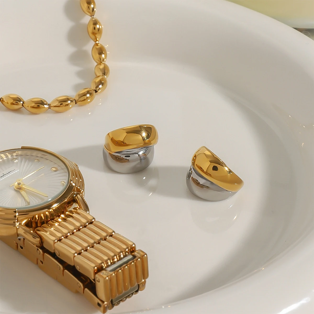 Enhance your style with these modern, stackable clip earrings crafted from stainless steel with PVD gold, weighing 15 grams. Featuring a minimalistic, irregular round design with a striking two-tone splice of shiny silver and rich gold, their smooth, polished surface reflects light beautifully. The adjustable clip mechanism ensures a comfortable fit for non-pierced ears, while the trendy, contemporary aesthetic effortlessly complements your everyday or chic ensemble. Waterproof, scratch-resistant, and fade-proof, these earrings are nickel, lead, and cadmium-free, offering durability and a stylish statement that elevates your look for any occasion.