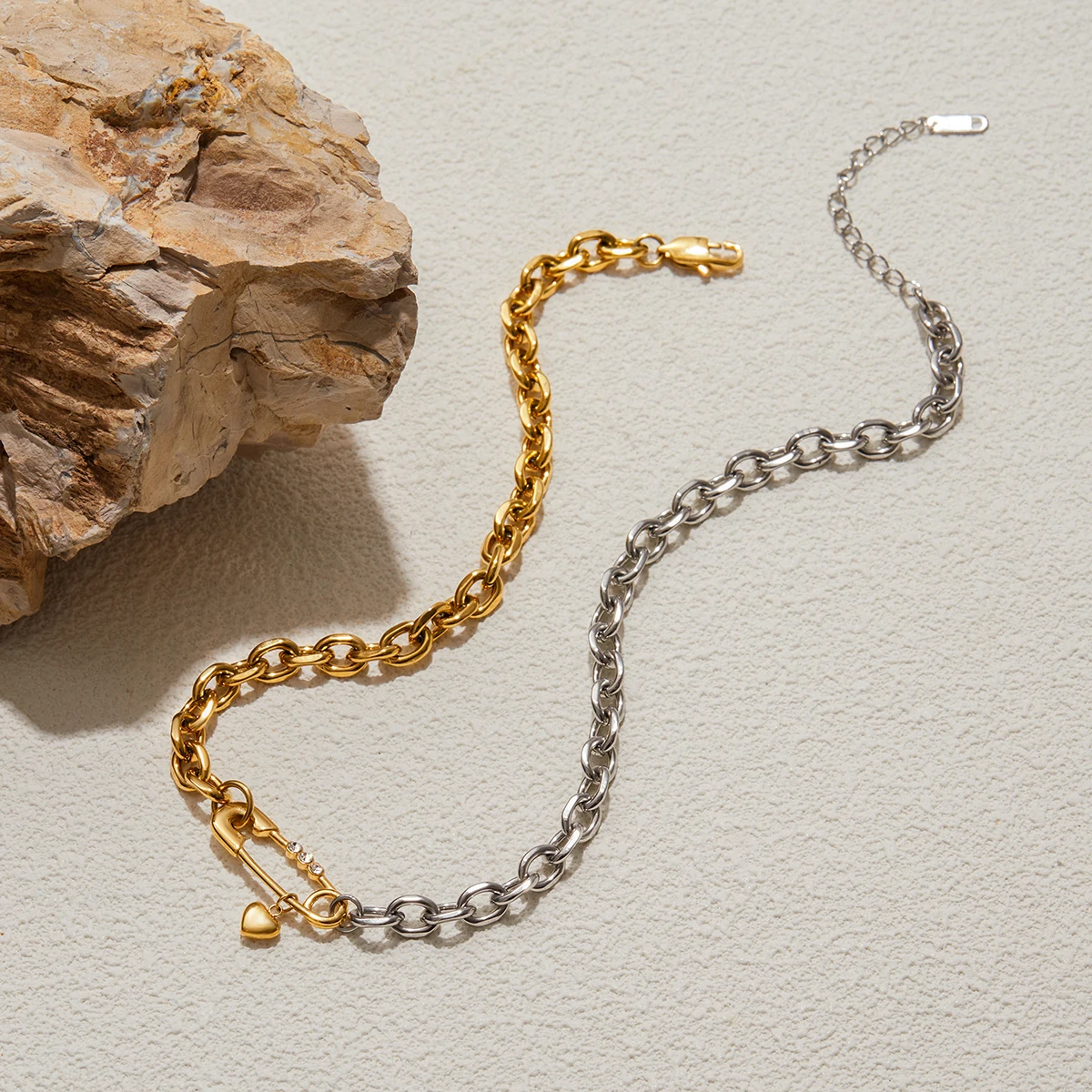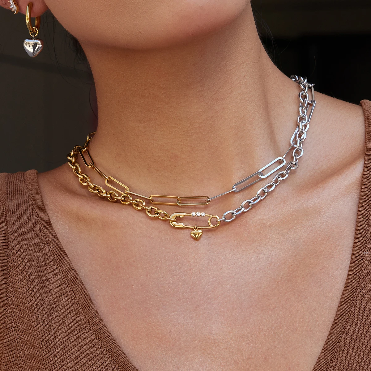 Discover timeless style with this stunning two-tone stainless steel pendant necklace. Crafted for women, it combines a sleek gold-colored geometric paper clip heart-shaped pendant with a versatile matching chain. The necklace’s polished finish and subtle zircon stone embellishments add a touch of sparkle, making it perfect for both casual outings and special occasions. Its waterproof design ensures durability and elegance in any setting. The classic link chain style complements the pendant’s modern shape, while the two-tone contrast offers a fashionable edge. Made with high-quality stainless steel, this piece promises long-lasting shine and comfort. Elevate your jewelry collection with this sophisticated, versatile accessory that speaks to contemporary fashion.