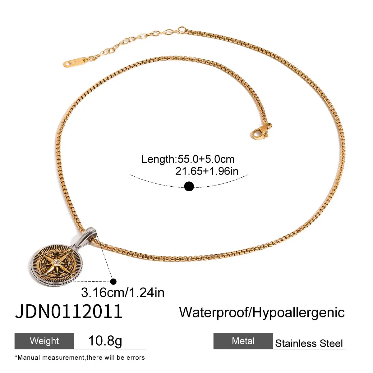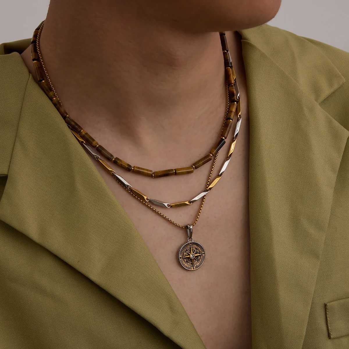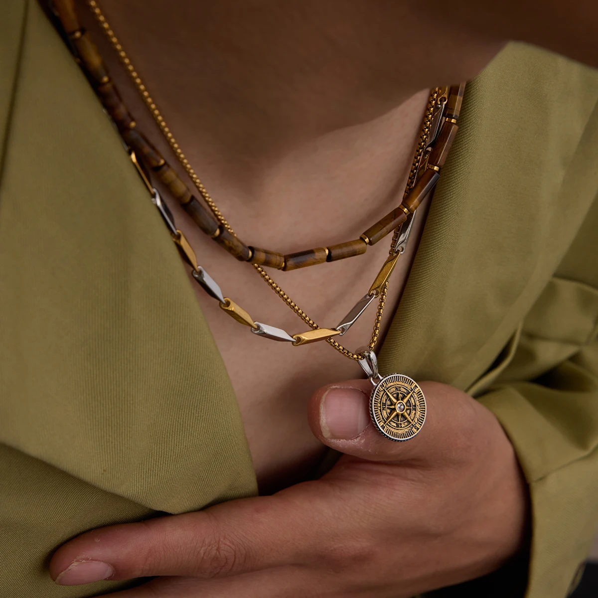 Experience the perfect blend of natural elegance and modern design with this beautifully crafted layered necklace. Made from durable stainless steel with a luxurious 18K PVD gold finish, it offers long-lasting color, anti-scratch protection, and waterproof qualities. The warm tiger eye bead string adds earthy charm, while the intricate compass pendant introduces a vintage-inspired touch. The sleek, two-tone chain links provide a fashionable edge, making this piece suitable for both casual and party occasions. Weighing just 15 grams, this lightweight necklace feels comfortable and effortlessly elevates your everyday style. Its versatile design and high-quality materials ensure you'll enjoy wearing it for years to come, making it an essential addition to your jewelry collection.