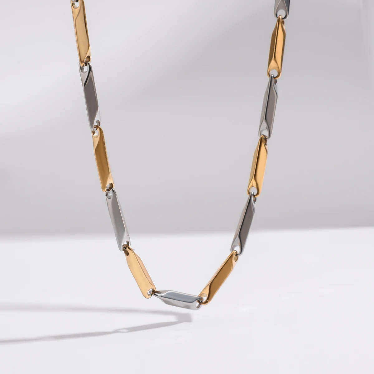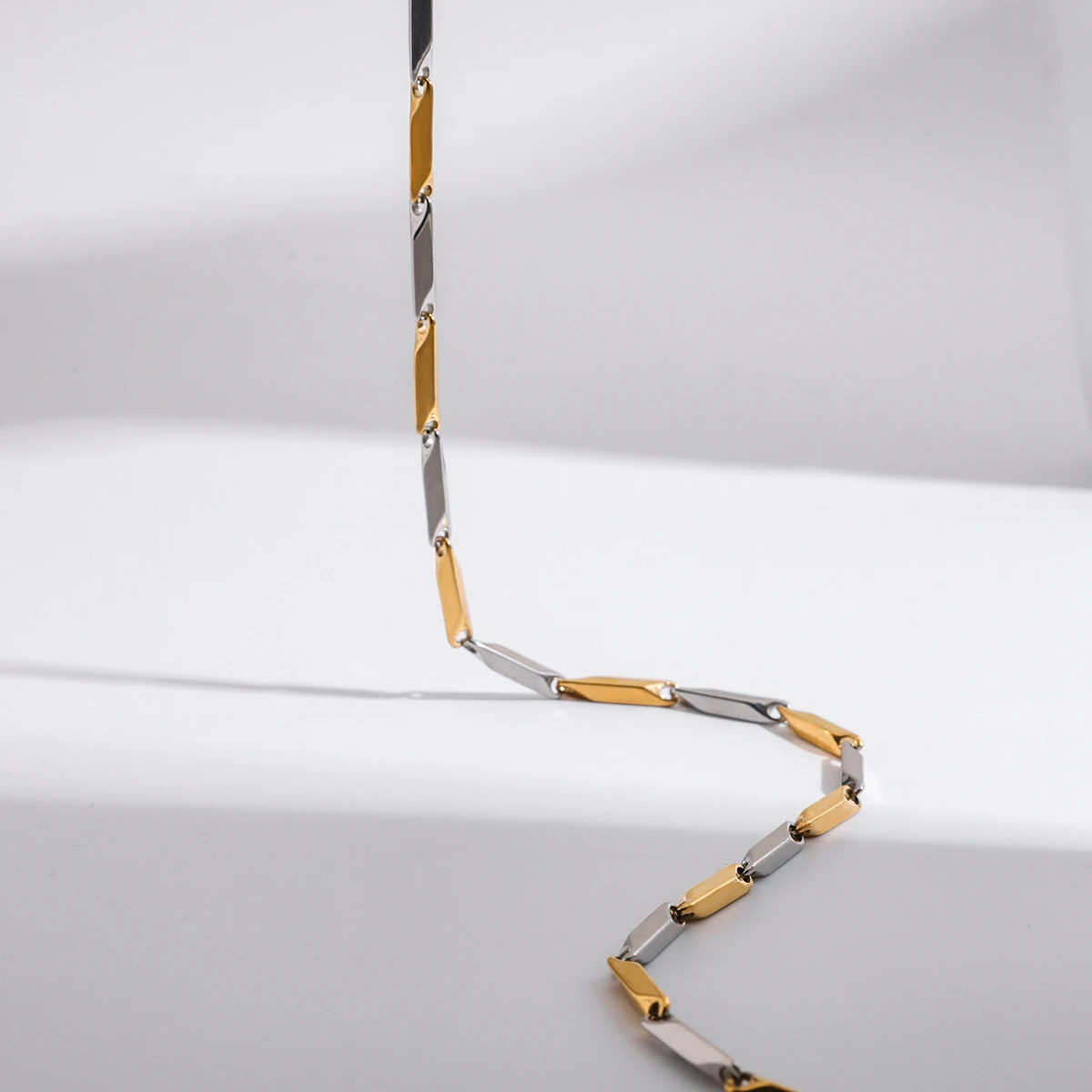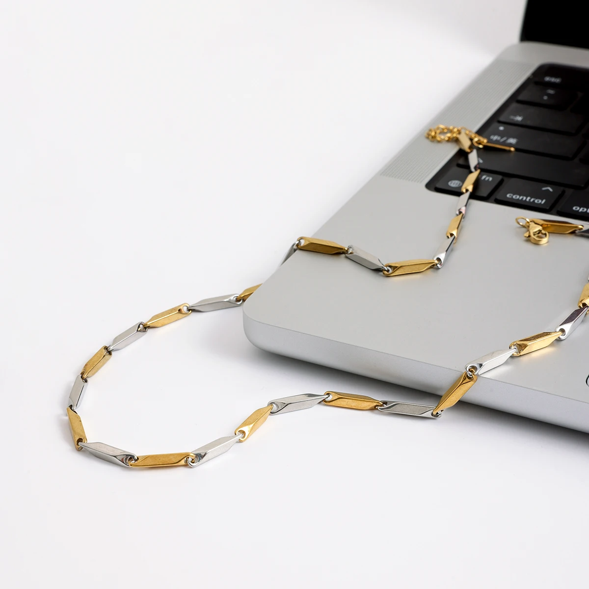 - Chain composed of elongated, slightly rounded rectangular links in dual gold and silver tones