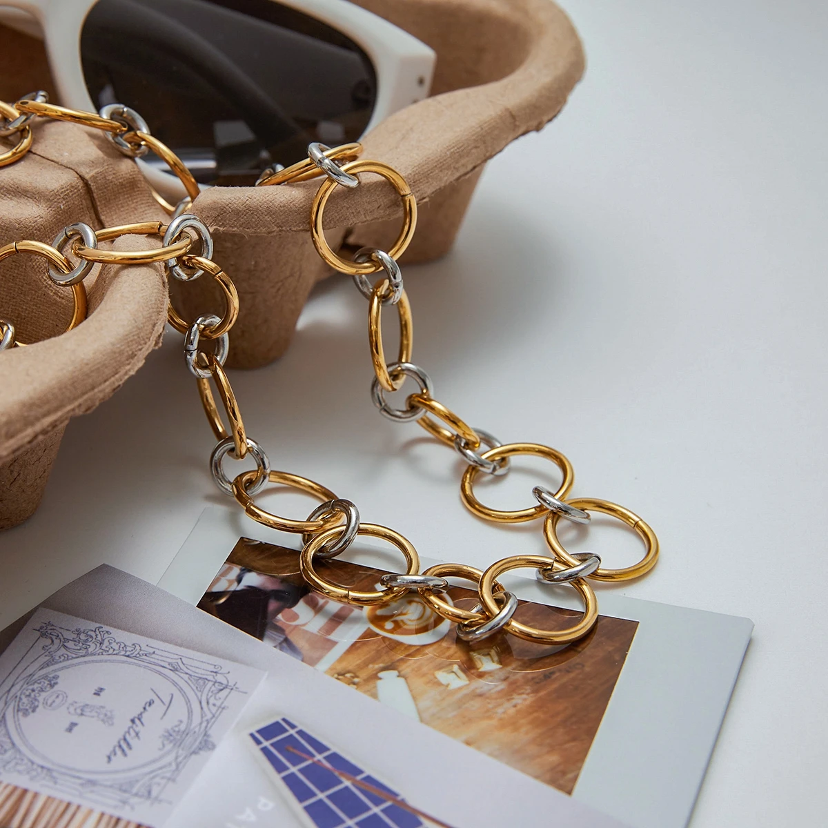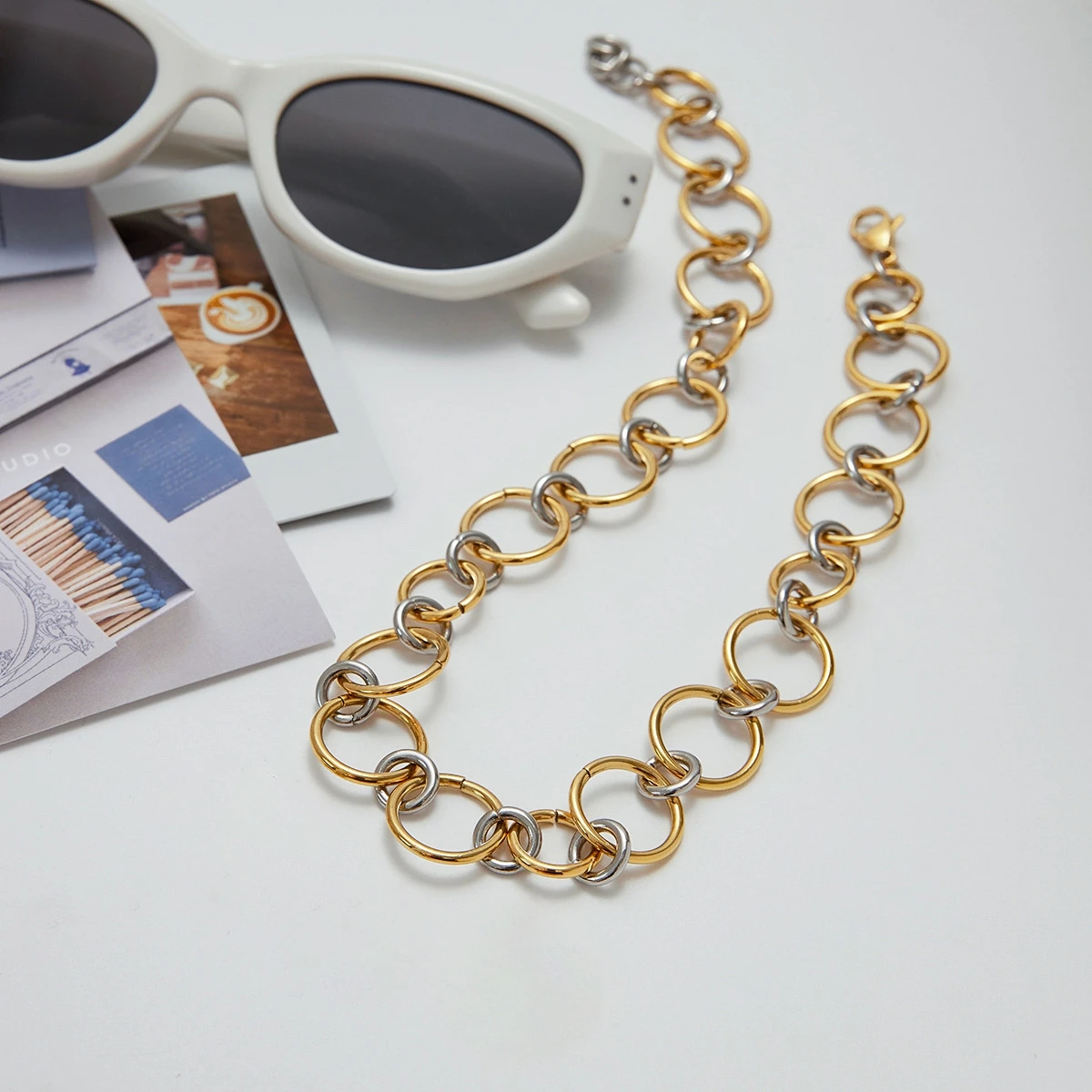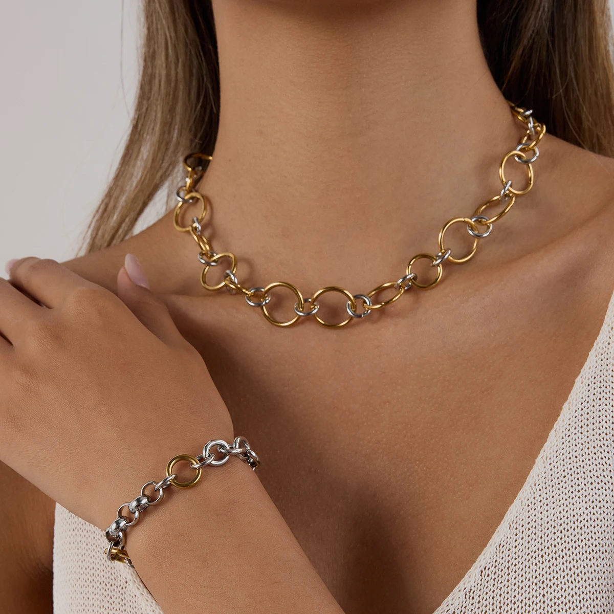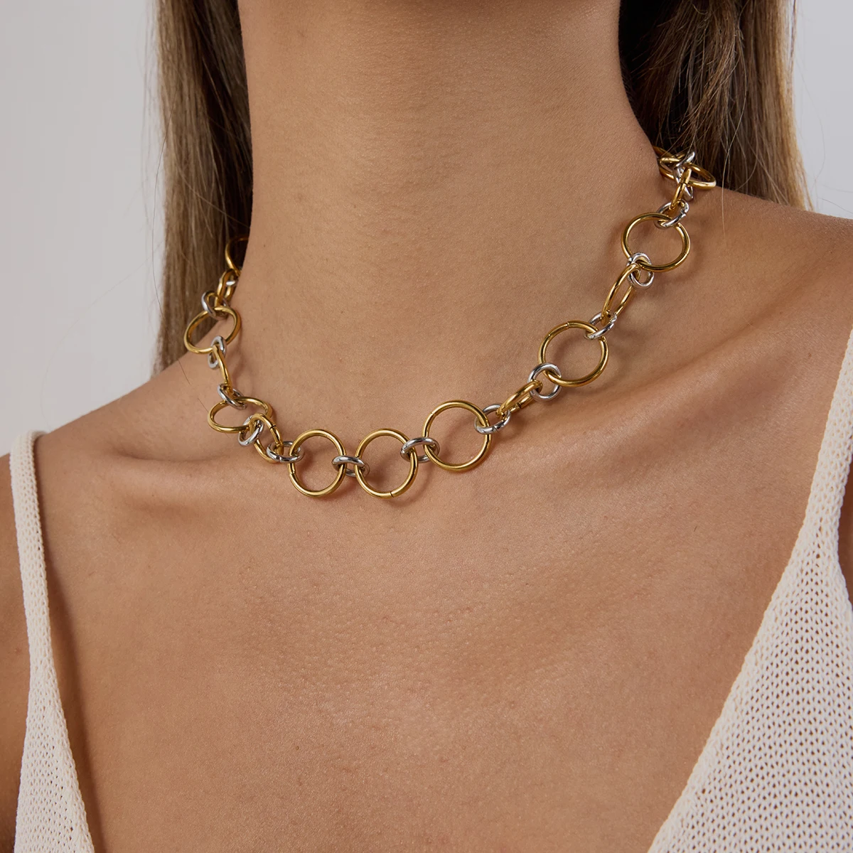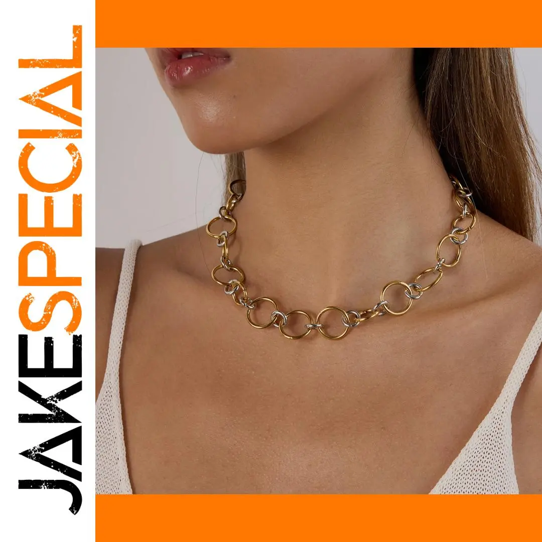 - This trendy women's necklace features a mixed gold and silver stainless steel two-tone circular link design, adding boldness and elegance suitable for any fashionable occasion.