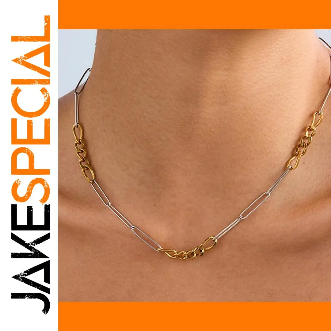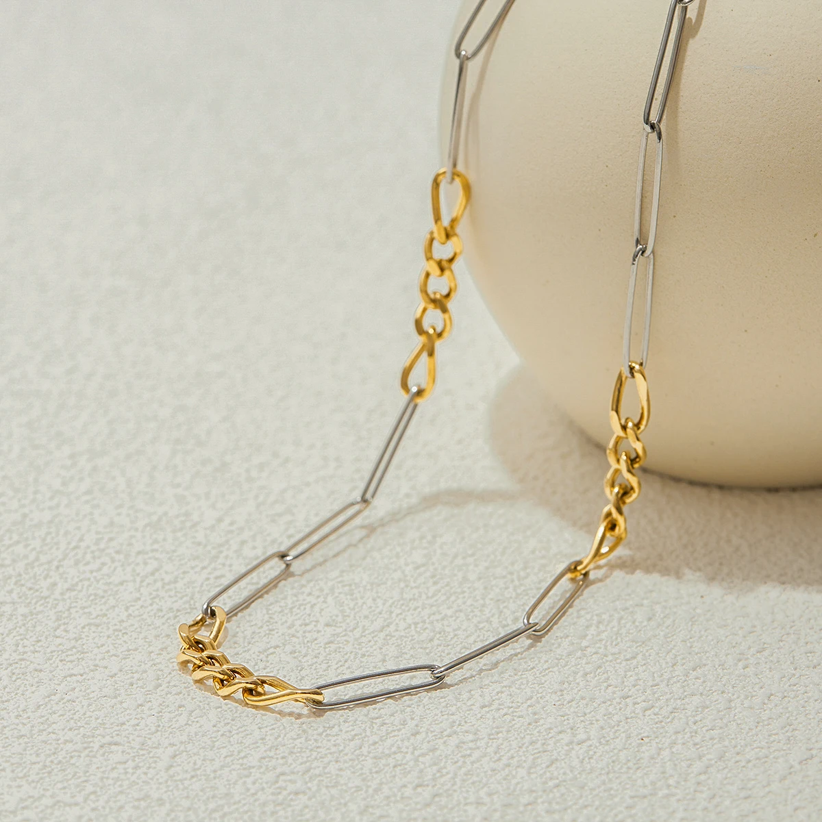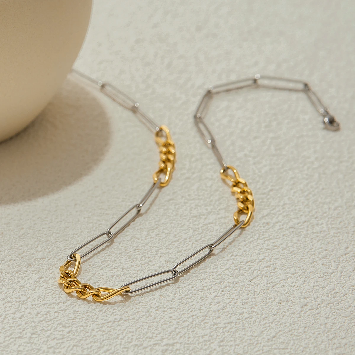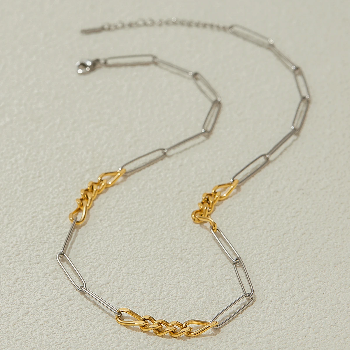 Elevate your style with this minimalist two-tone paper clip chain necklace, crafted from durable stainless steel in a sleek gold color. Measuring approximately, it features elongated rectangular links alternating between smooth, shiny gold segments with subtle rounded edges and elongated, uniform silver links for a modern, geometric look. Its versatile design is perfect for parties and various occasions, seamlessly complementing any outfit. The slip-on, clasp-free construction offers a seamless, refined appearance, making it an ideal accessory for those who appreciate contemporary elegance and everyday sophistication. Made in Zhejiang, this fashion-forward necklace effortlessly combines style and durability.