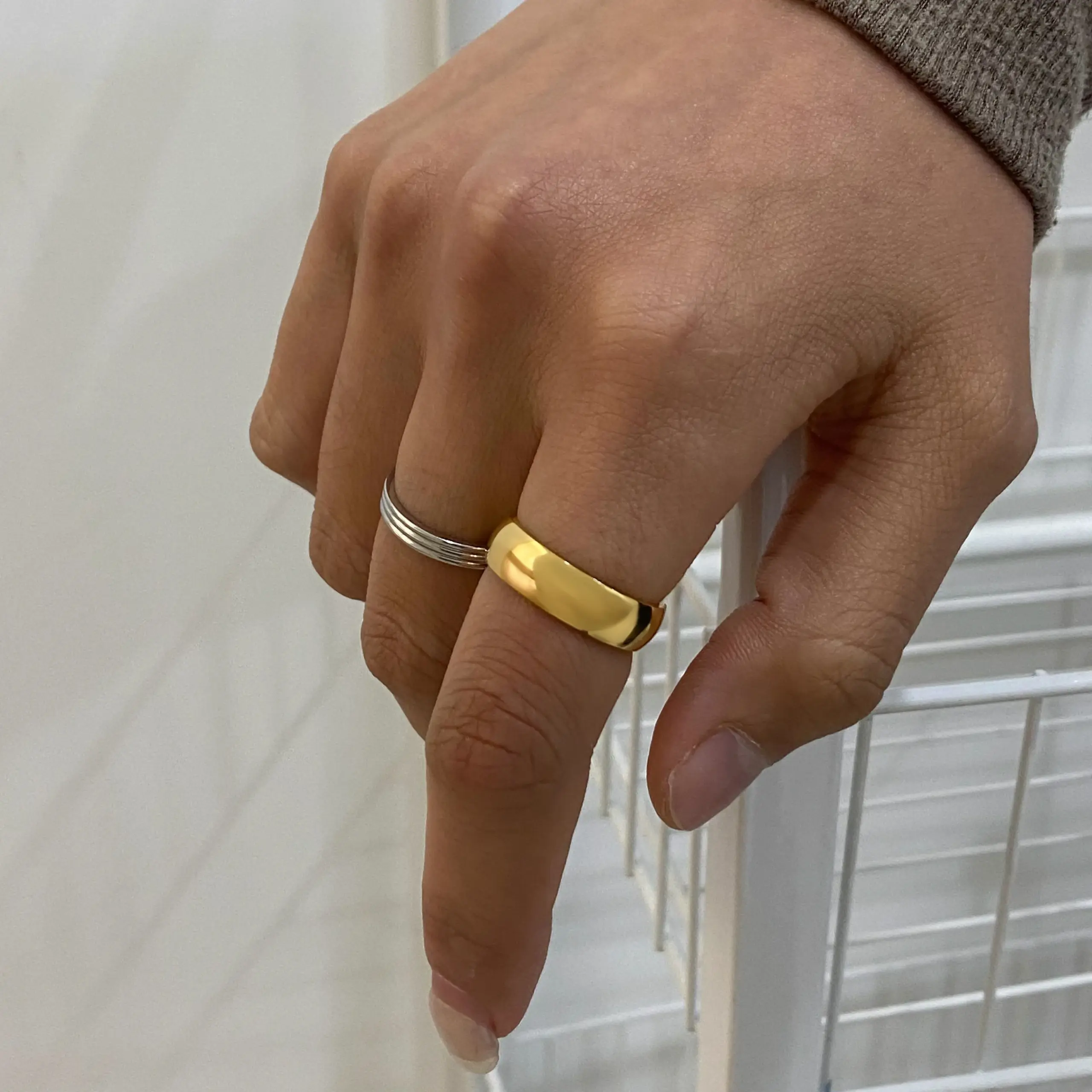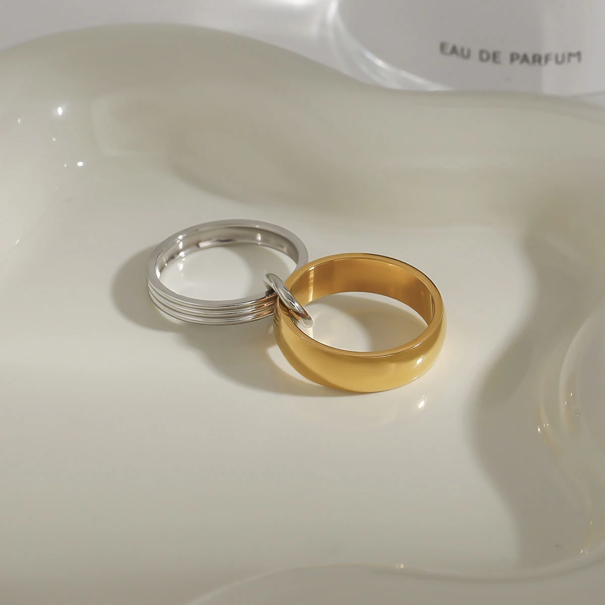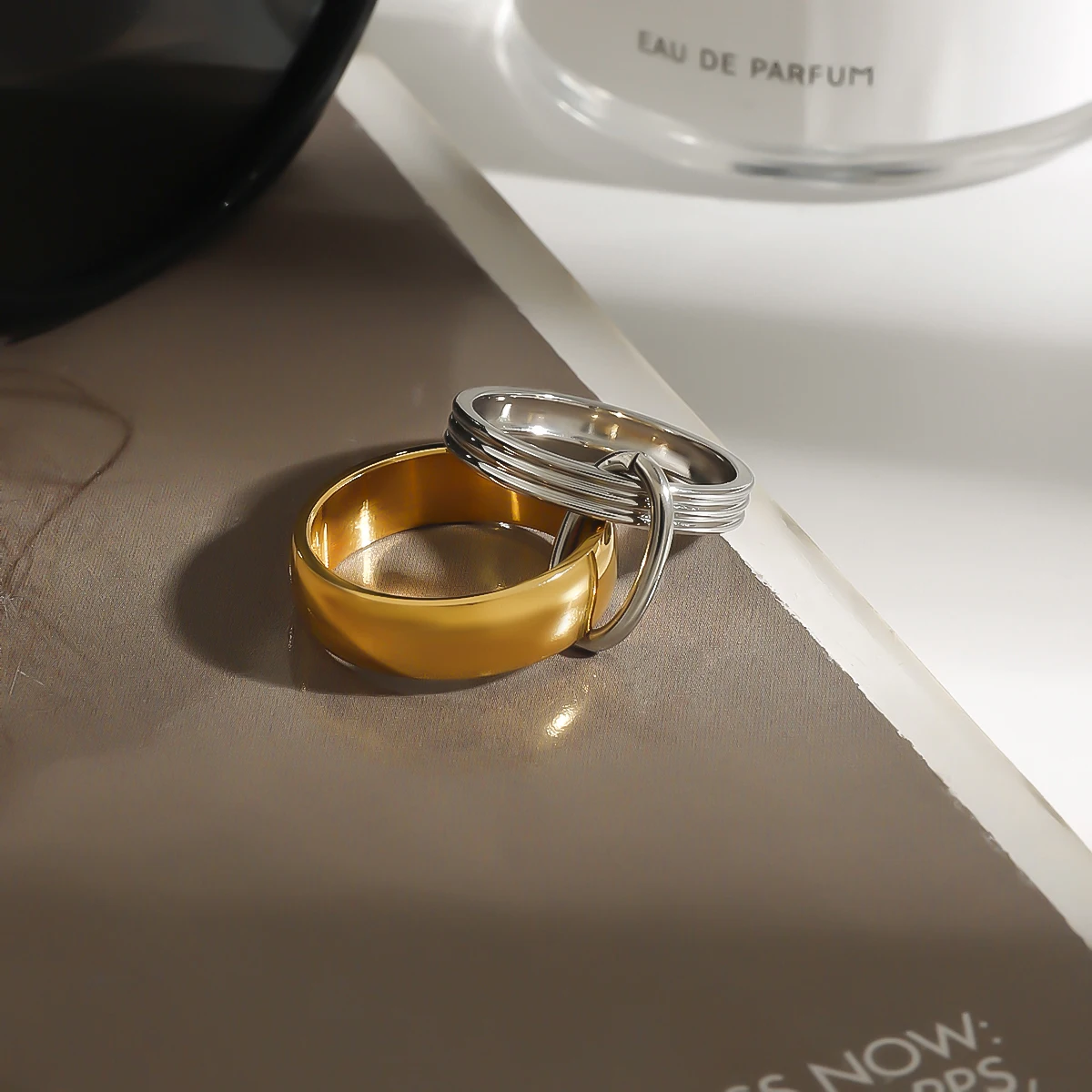 Step into sophistication with this minimalist two-tone ring, crafted from durable stainless steel with a lustrous PVD gold finish. Its sleek, 2mm wide surface features a modern rectangular or slightly curved top, reflecting light beautifully to enhance your look. The contrasting glossy gold and silver tones exude elegance and trendiness, making it perfect for parties and special occasions. Light yet substantial at 15 grams, this piece offers superb comfort while maintaining a high-end aesthetic. The high-quality finish ensures long-lasting color, scratch resistance, and waterproof properties, making it ideal for daily wear. Embrace a versatile style that complements any outfit and showcases your fashion-forward taste effortlessly.