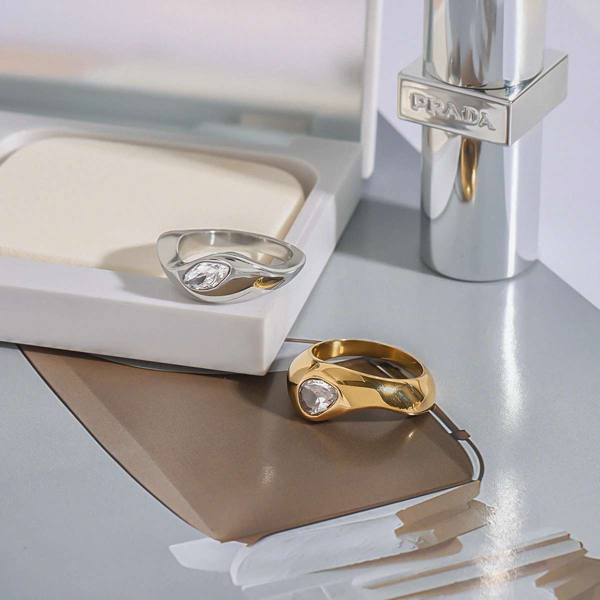 - This model features a unique layered, double-band design with a shiny surface and elegant gemstone details, embodying contemporary fashion with timeless appeal.