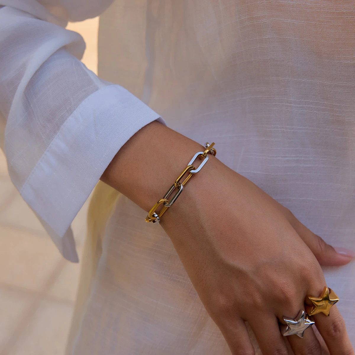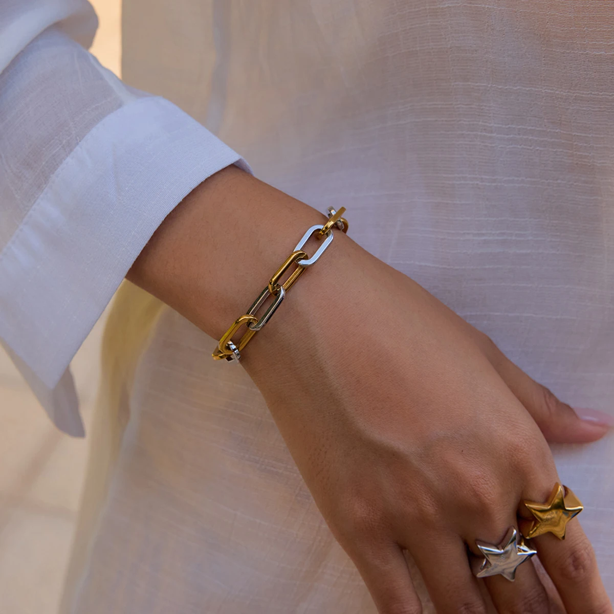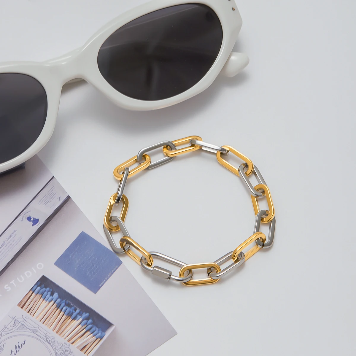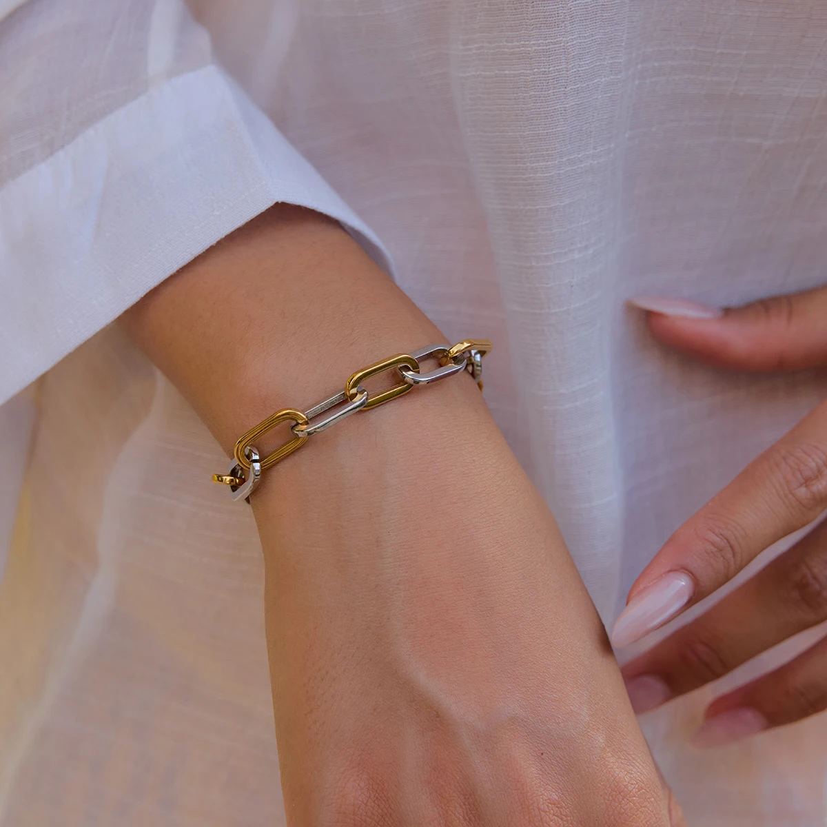 Elevate your style effortlessly with this minimalist women's bracelet. Crafted from durable stainless steel, it features an elegant two-tone design combining gold and silver hues. The geometric, elongated rectangular links with rounded edges create a modern and sleek aesthetic that complements both casual and formal outfits. The polished surface adds a sophisticated shine, making it a versatile accessory for any occasion. Its lightweight construction ensures comfort while maintaining a trendy look. Securely fastened with a lobster-claw clasp, this bracelet is easy to put on and take off, providing a reliable fit. Whether you're dressing up for a party or adding a touch of elegance to your daily attire, this bracelet is the perfect fashionable companion to enhance your look.