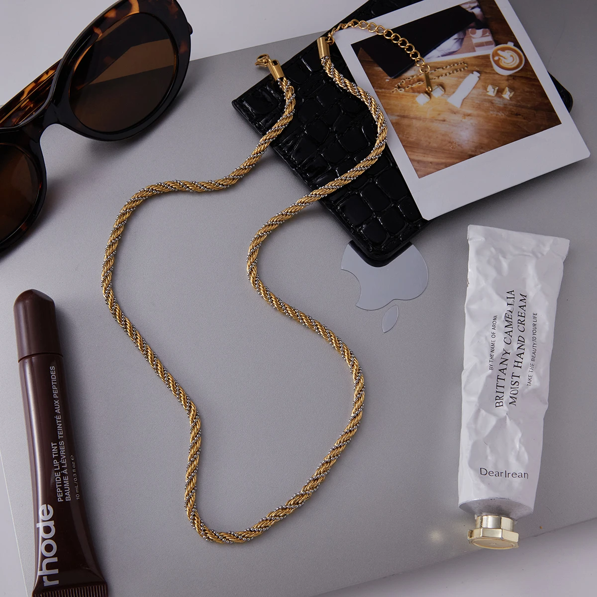 Immerse yourself in the chic charm of this this trendy women's necklace, expertly crafted with a sophisticated two-tone design featuring gold accents over durable stainless steel. The delicate chain showcases small, oval links woven in a twisted, braided pattern, forming a gentle round motif that gracefully rests on your collarbone. Its polished, shiny finish exudes elegance, making it perfect for both casual outings and festive occasions like parties. The high-quality stainless steel ensures long-lasting wear, resistance to corrosion, and a sleek look without any chemical treatments. With a standard length that fits comfortably and suits all styles, this necklace embodies modern fashion with timeless appeal, instantly elevating your ensemble with subtle sophistication.