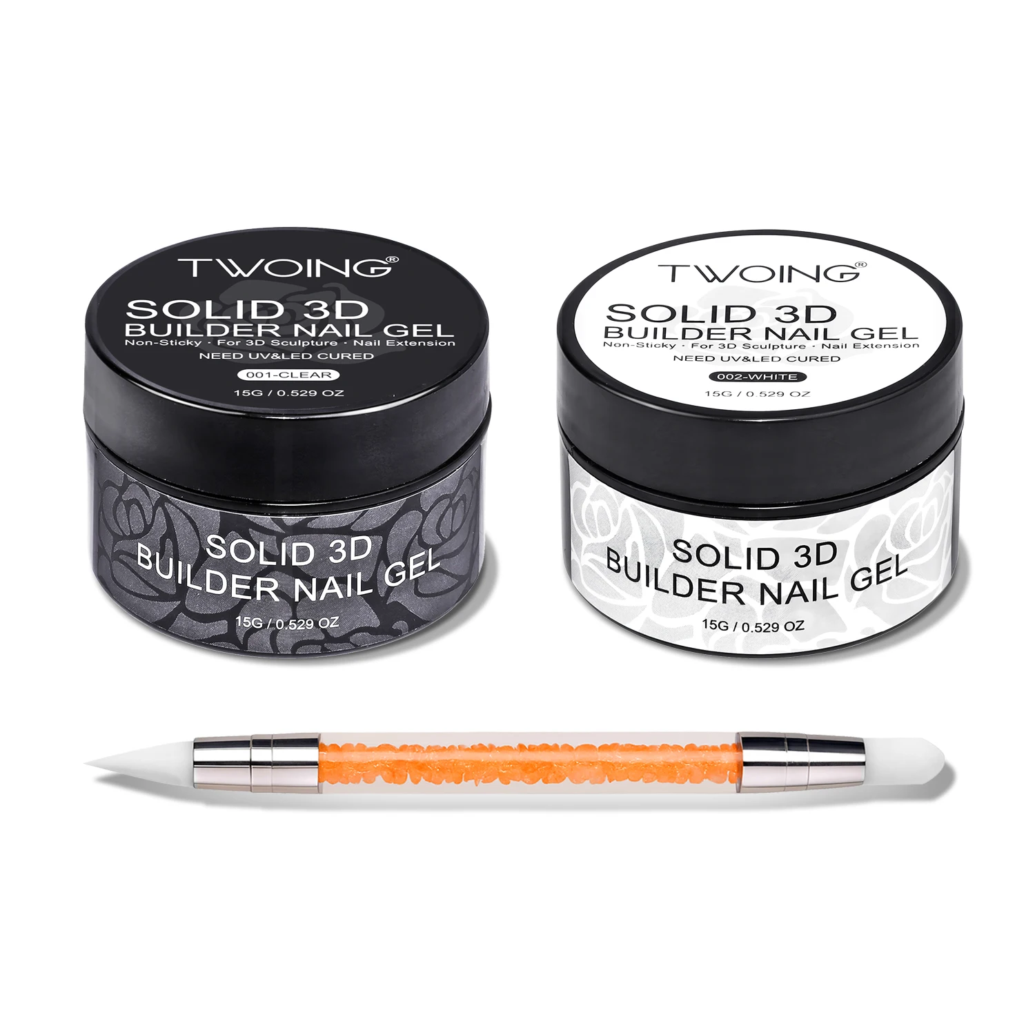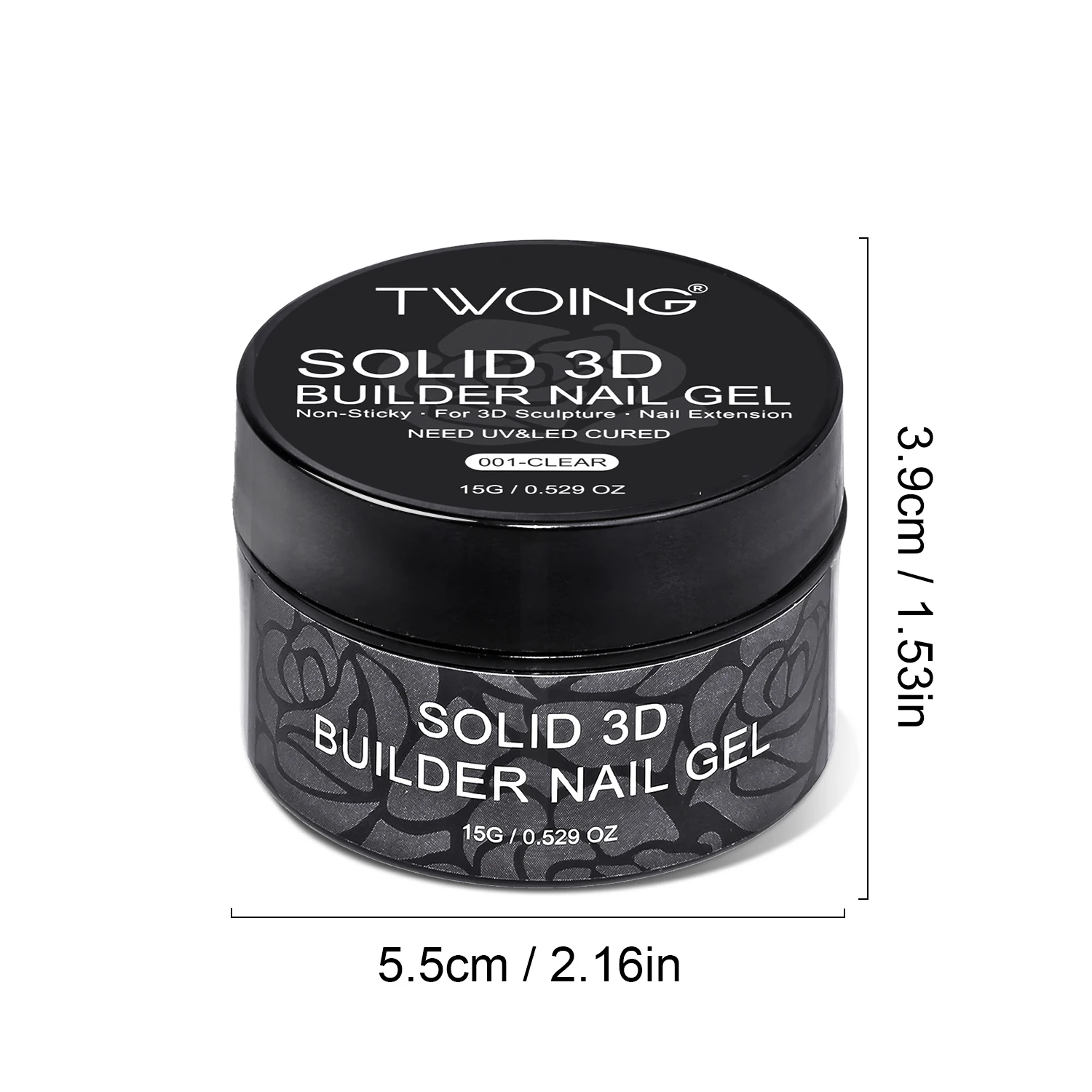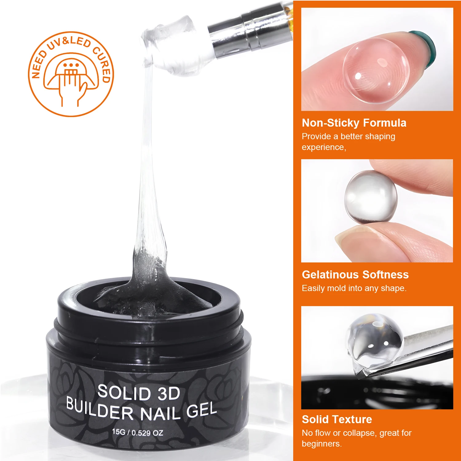 Experience professional-quality nail artistry with this set of two 15g solid hard extension gels in clear and white, designed for sculpting, 3D carving, and nail extensions. Each gel features a resin-based, non-stick formula that ensures easy application and durability for intricate nail designs. The clear gel allows for creating transparent effects, while the white gel provides a solid base or highlight. With no concerning chemicals and CPNP certification, these gels are suitable for both professional salons and DIY enthusiasts aiming to craft elegant, long-lasting 3D nail art with a glossy, smooth finish.