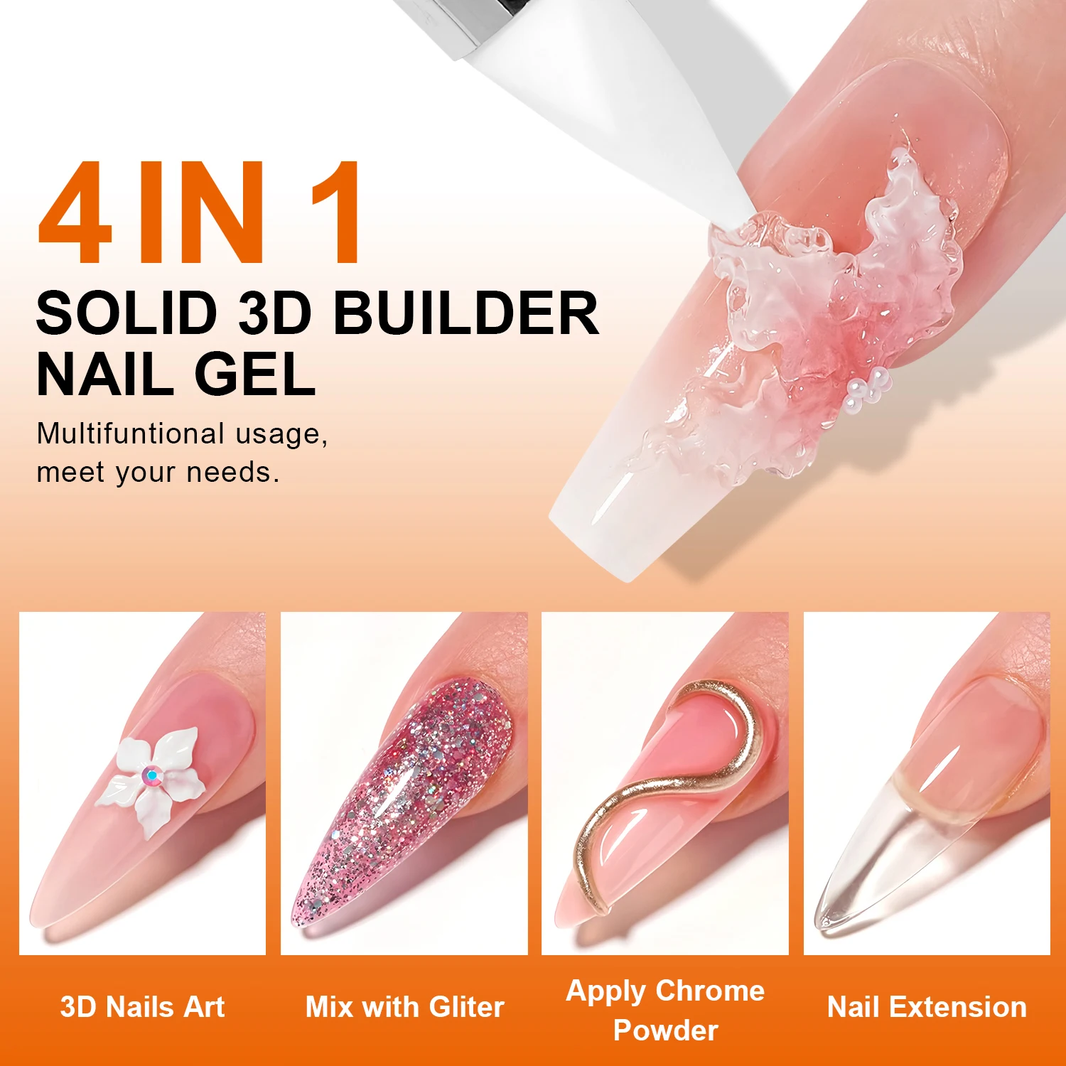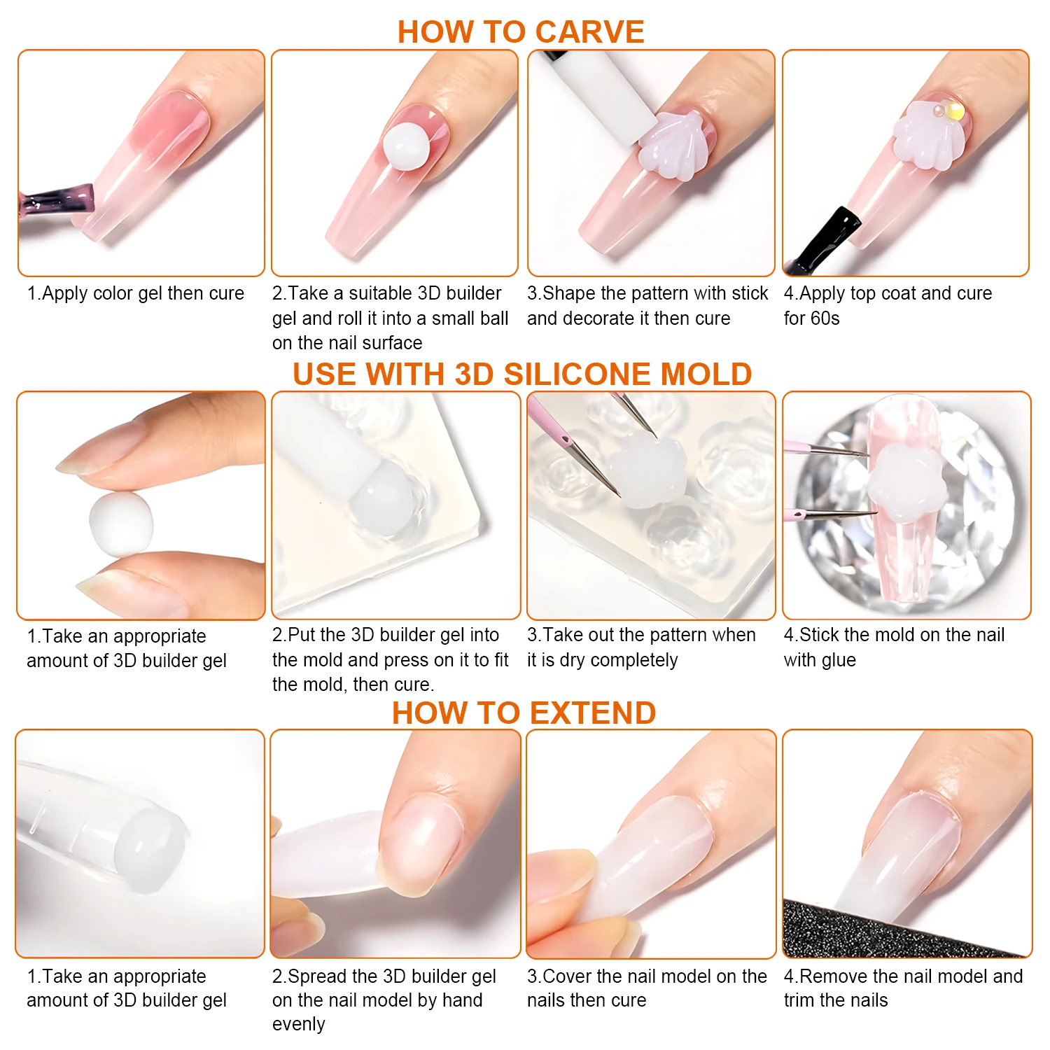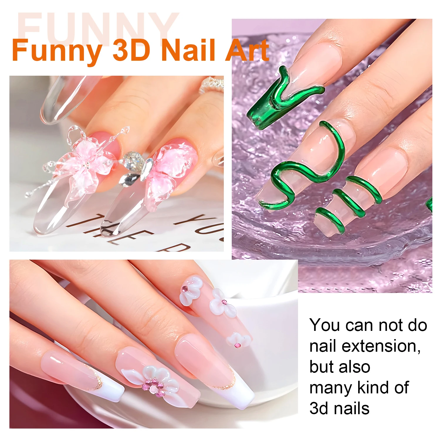 Experience professional-quality nail artistry with this set of two 15g solid hard extension gels in clear and white, designed for sculpting, 3D carving, and nail extensions. Each gel features a resin-based, non-stick formula that ensures easy application and durability for intricate nail designs. The clear gel allows for creating transparent effects, while the white gel provides a solid base or highlight. With no concerning chemicals and CPNP certification, these gels are suitable for both professional salons and DIY enthusiasts aiming to craft elegant, long-lasting 3D nail art with a glossy, smooth finish.