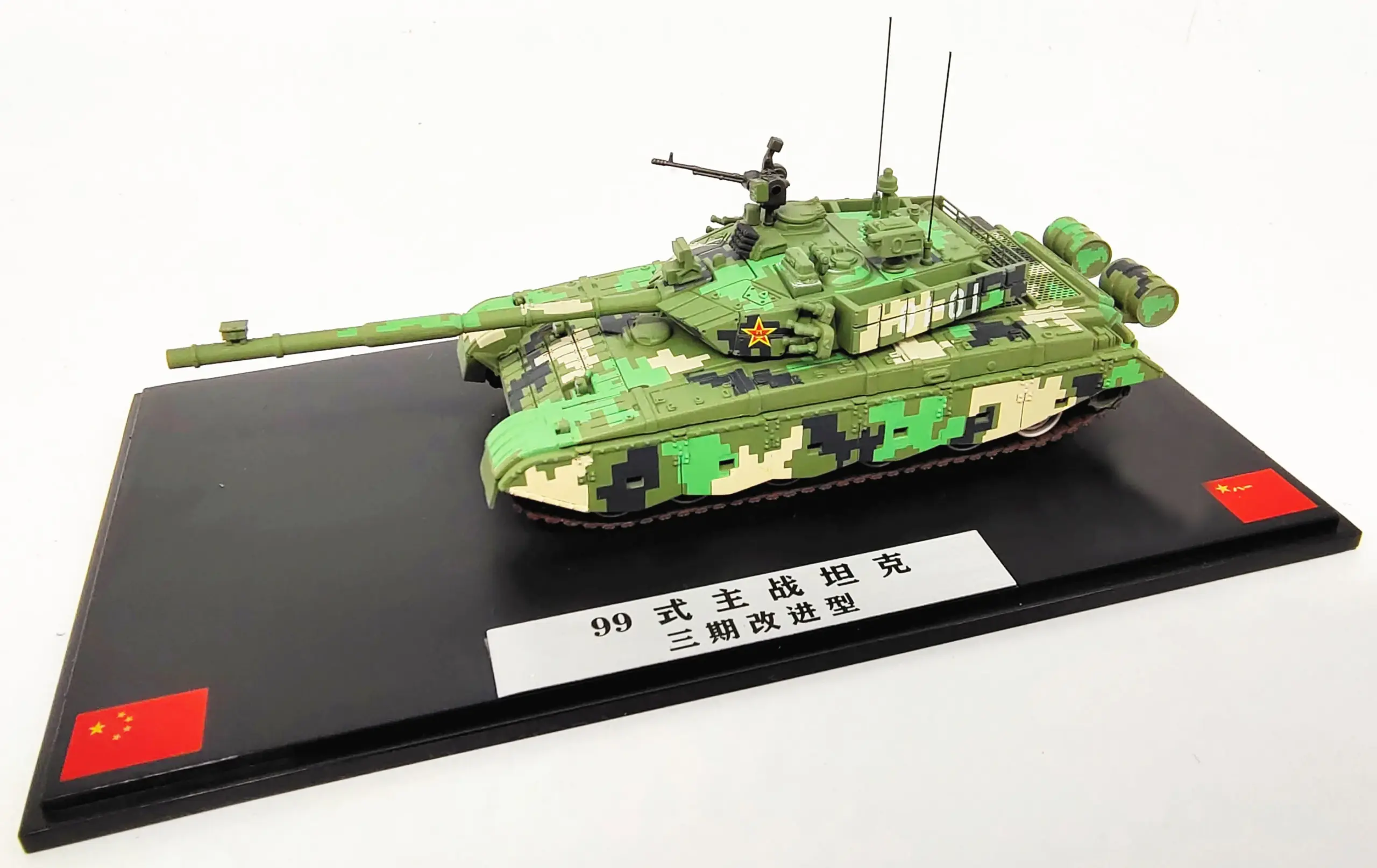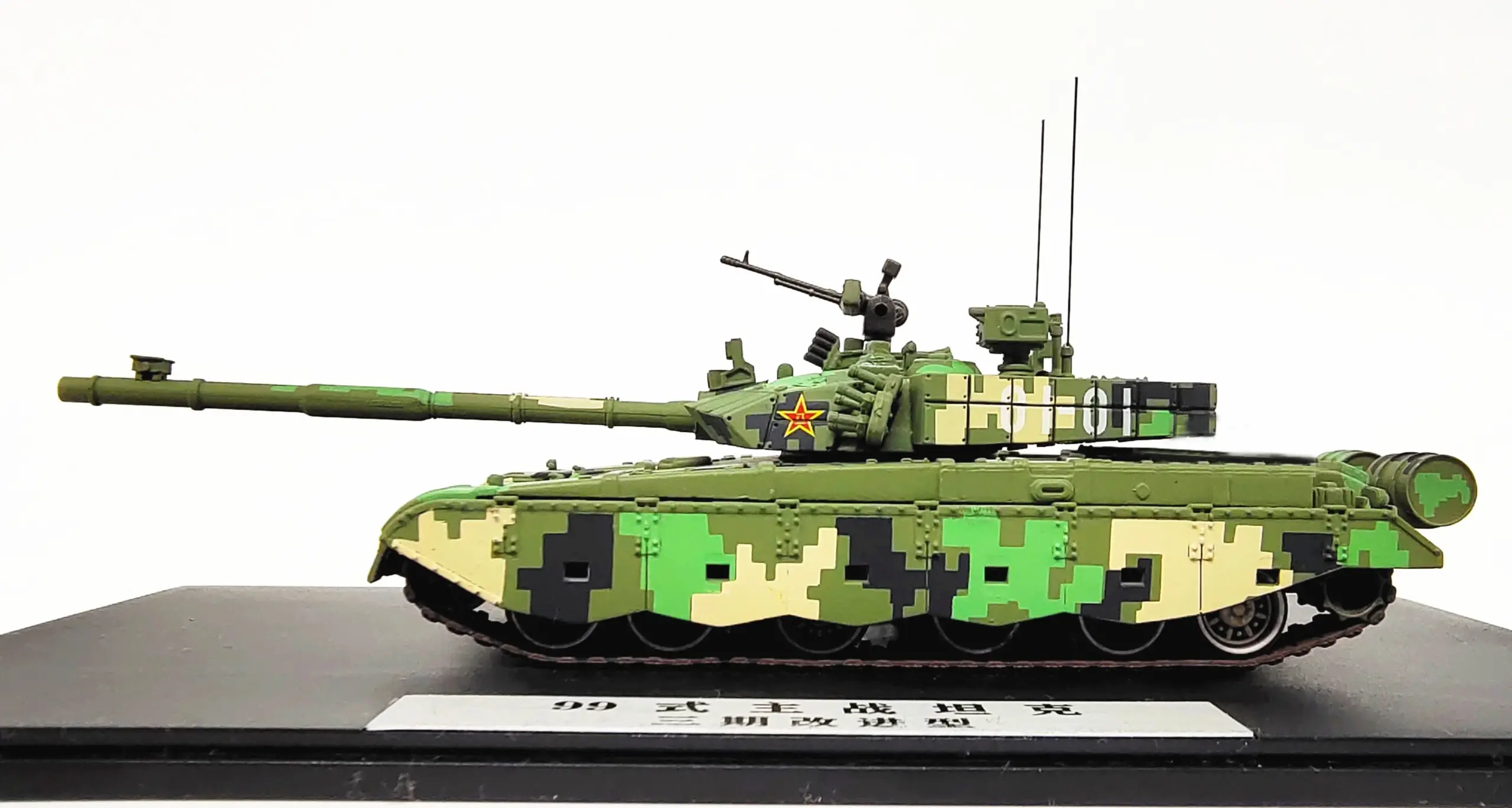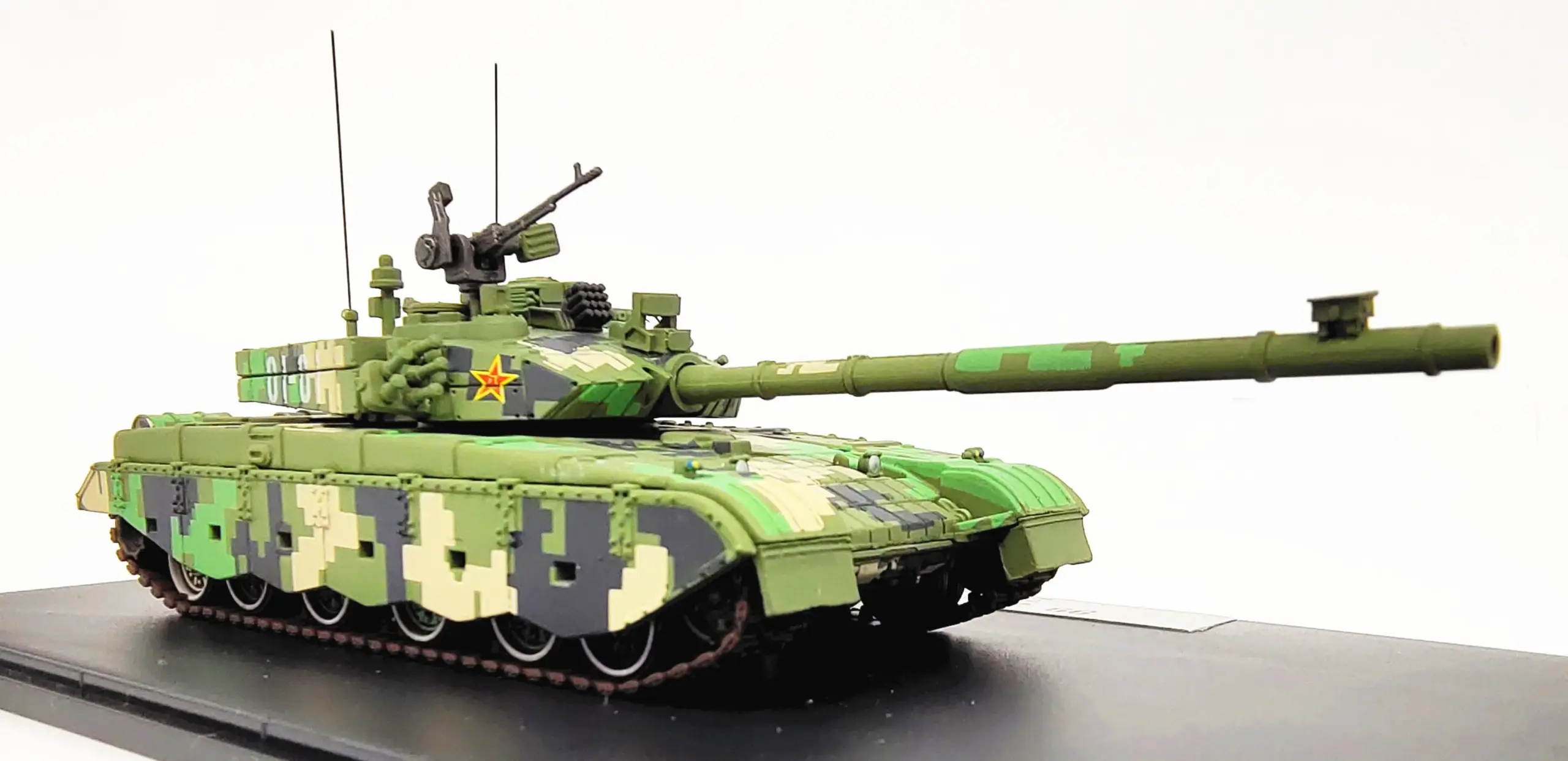 This exquisite 1:72 scale model of the Chinese Type 99 main battle tank brings military history to life in your collection. Featuring a diecast construction, the model showcases a captivating digital camouflage pattern in various shades of green and black. Intricately designed, it includes an adjustable long gun barrel, a rotating turret, and an additional machine gun for dynamic display options. The alloy body, complemented by rubber tracks, adds to its authenticity. With dimensions of 16 cm in length (with the barrel) and 5 cm in width, this beautifully detailed piece rests on a sleek black base, perfect for showcasing your passion for military models.