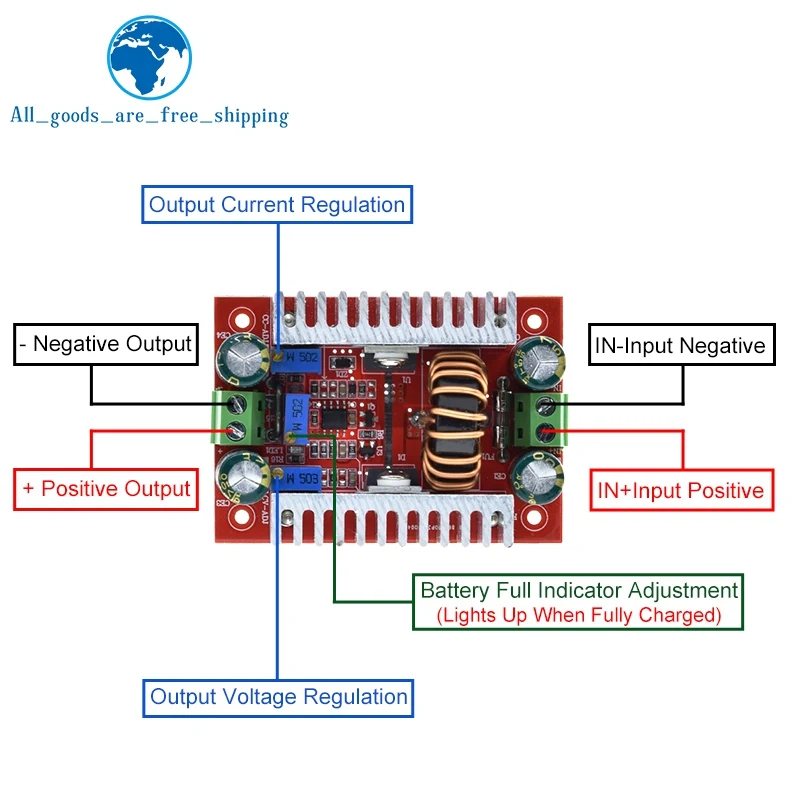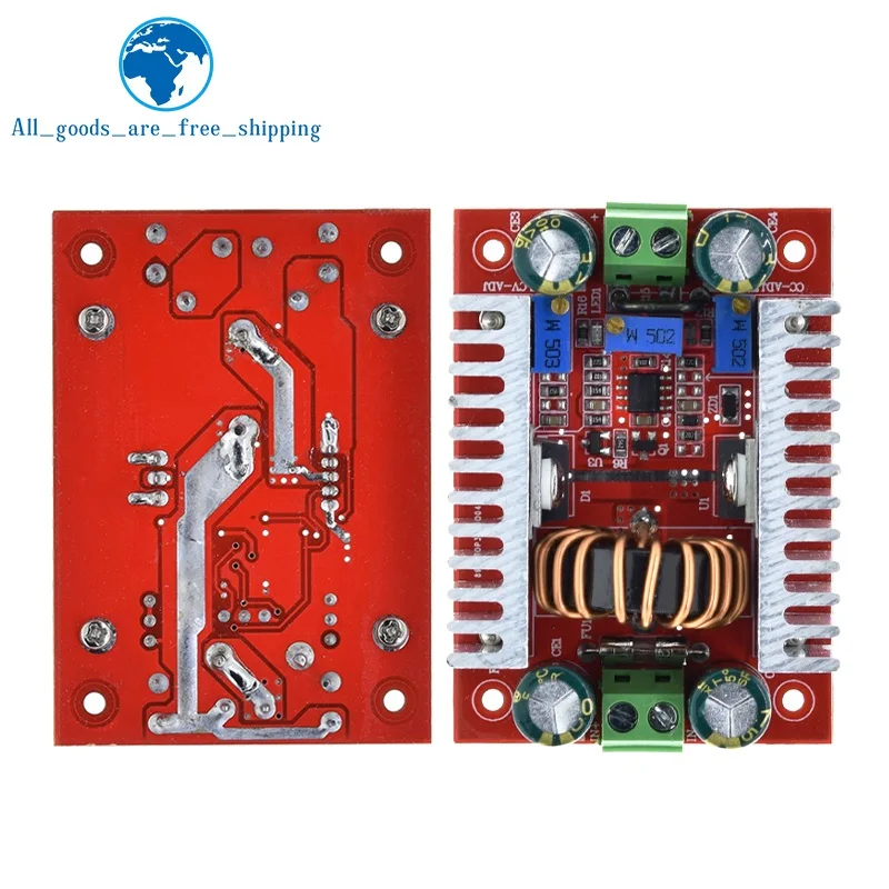 Experience reliable voltage conversion with this compact, professional-grade TZT DC-DC step-down converter. Featuring a striking red circuit board, it combines aesthetic appeal with robust design. The module boasts two large aluminum heat sinks with vertical fins, ensuring superior heat dissipation for continuous operation. At the core, a shiny copper coil provides efficient energy transfer, while colorful capacitors add a vibrant touch to its technical appearance. With input voltage support from 5V to 40V and an adjustable output range of 1V to 36V, it handles up to 10A of current, making it ideal for battery charging and electronic projects. The metal terminal blocks and blue connectors allow secure, versatile connections, giving you a seamless experience in customizing your power setup for automotive or other high-demand applications. This high-performance controller is designed for adult enthusiasts who demand precision and durability.