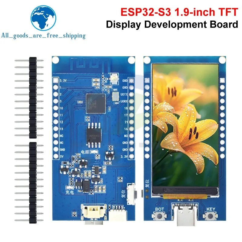 Experience the seamless integration of technology and design with this TZT ESP32-S3 development board, featuring a vibrant 1.9-inch IPS LCD display. Its crisp resolution of 170×320 pixels, powered by the ST7789 controller, offers stunning visuals with lush green leaf imagery on a striking blue background. The bright blue PCB enhances the modern aesthetic, complemented by black components and gold-plated pin headers that add refinement. White multi-pin connectors provide versatile connectivity options, making this board ideal for innovative projects. Its compact size, combined with advanced dual WiFi and Bluetooth 5.0 support, empowers you to develop efficient, connected devices. This brand-new, reliable development platform is perfect for hobbyists and professionals alike, encouraging creative exploration.