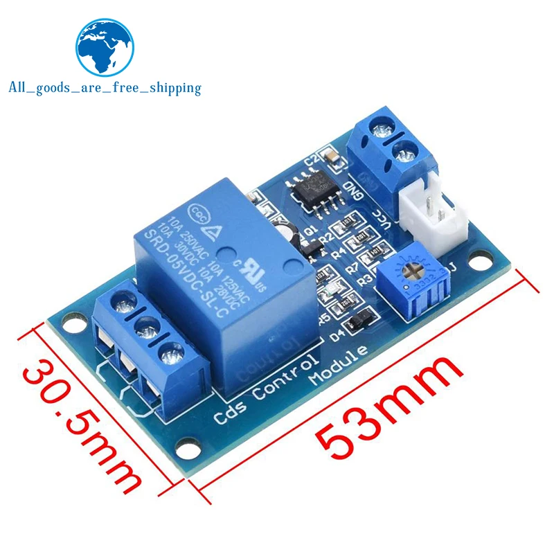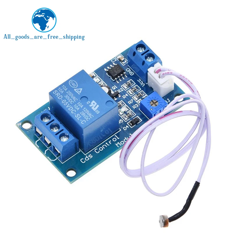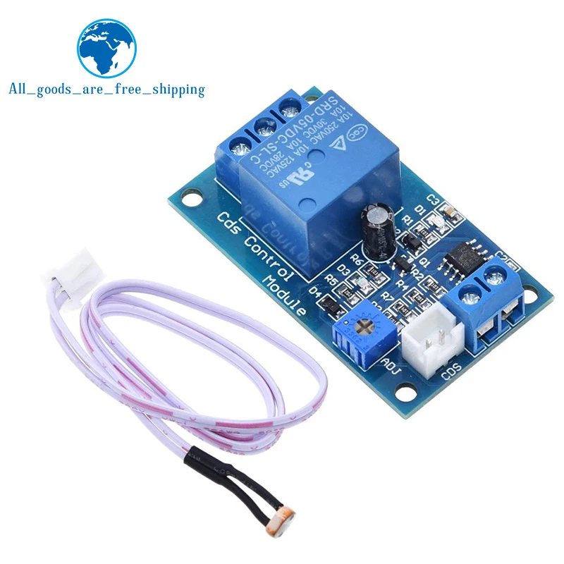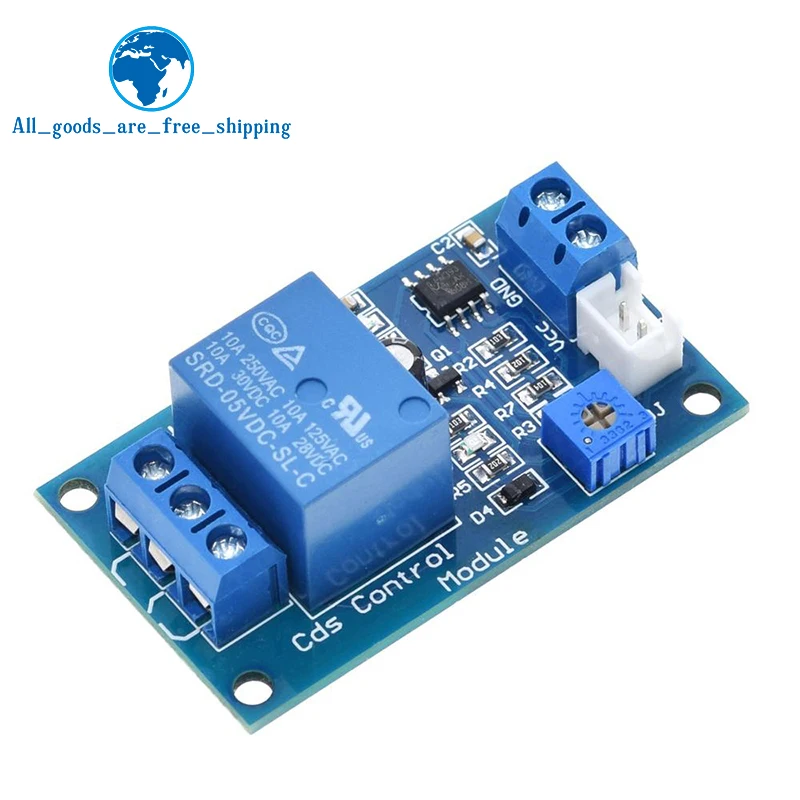 Experience seamless light automation with the TZT XH-M131 DC 5V/12V Light Control Switch Photoresistor Relay Module. Designed with a sleek blue rectangular relay and a small cylindrical photoresistor sensor featuring a transparent top with dark and light patterns, this compact module combines modern aesthetics with advanced functionality. Capable of switching up to 10A at DC voltages of 5V or 12V, it features white wiring for easy integration into computer lighting or ambient light control projects. Available in options of 1 piece or 3 pieces, this new, customized module is perfect for users looking to automate lighting based on environmental brightness with precision and reliability.