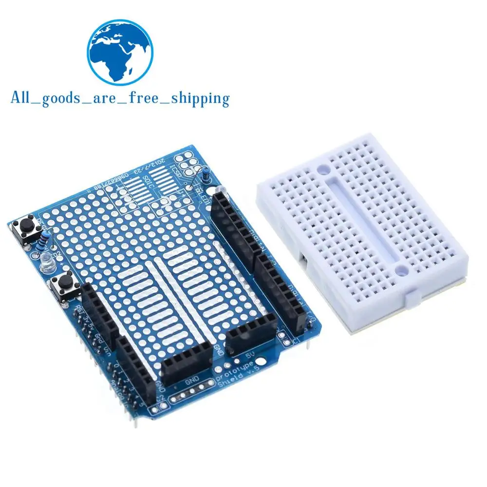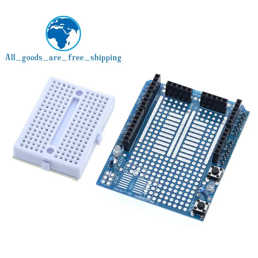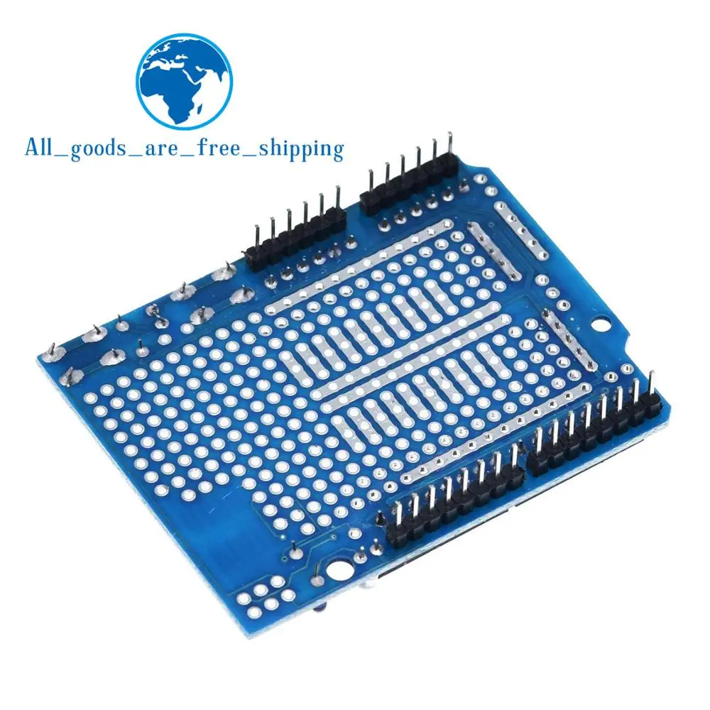 This high-quality prototype expansion board features a vibrant blue PCB with white silkscreen markings, designed for seamless integration with UNO microcontrollers. The compact size of 7 cm x 5.5 cm x 2 cm houses a 4.4 cm x 3.4 cm x 1 cm white mini breadboard with 170 tie points, attached with a self-adhesive backing. It includes all pins brought to the top level, a reset button, a general-purpose button, and two LED circuits for immediate use. Exposed pins for 5V, GND, and Raw, along with a dedicated SOIC IC placement area, make this versatile shield ideal for electronic development and experimentation.