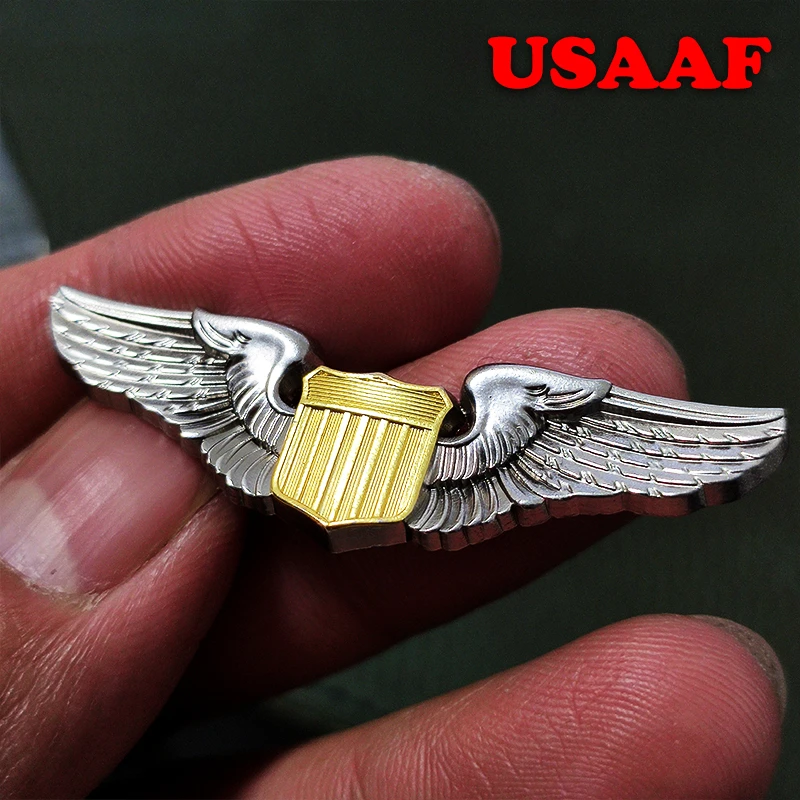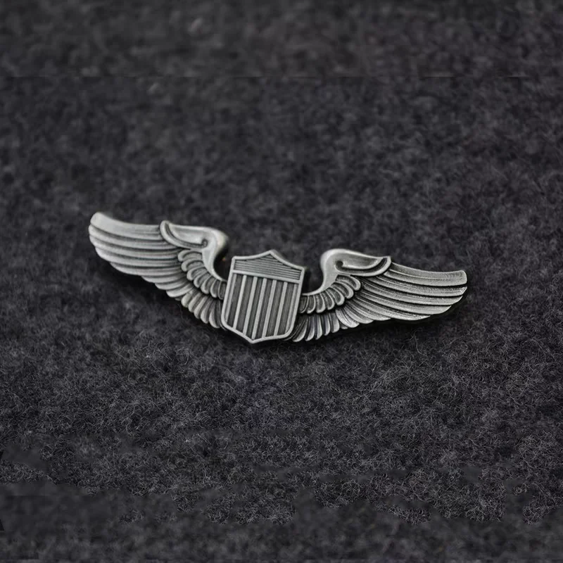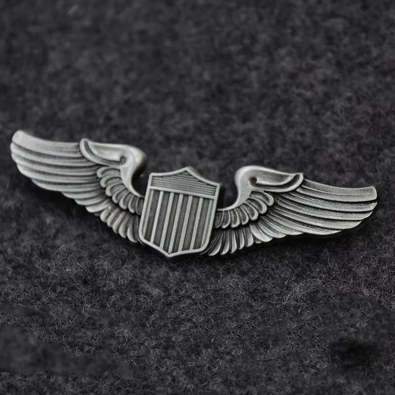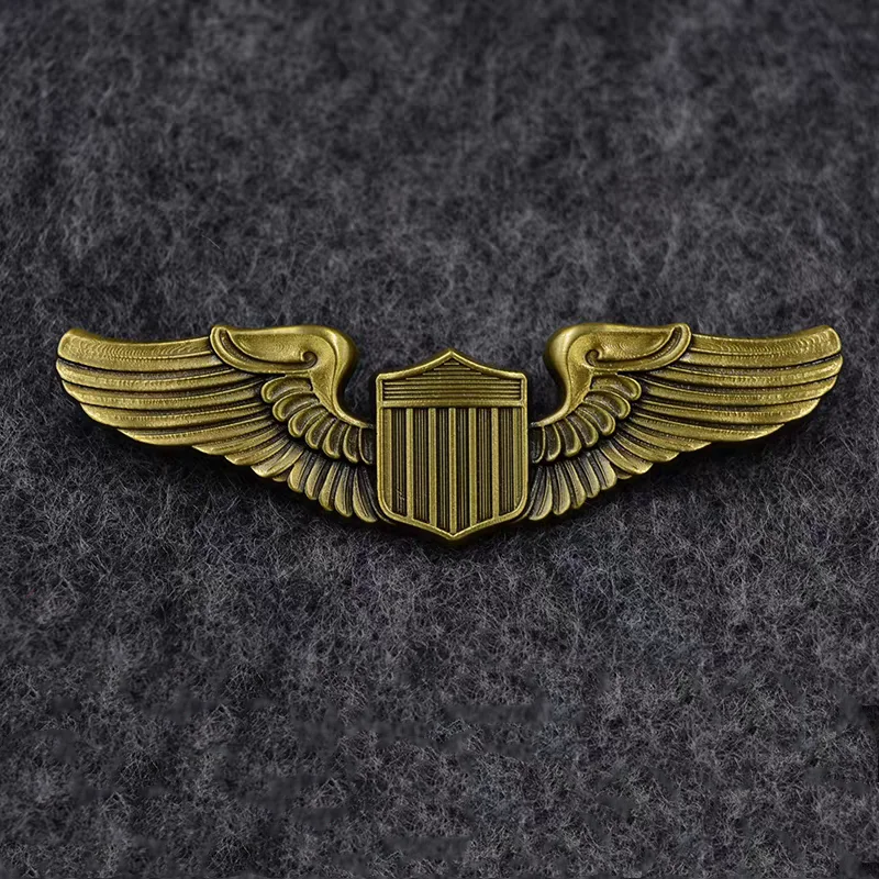 Imagine owning a piece of history that beautifully captures the patriotic spirit and military craftsmanship. This intricately designed badge features a shiny, textured gold shield at its center, surrounded by detailed, silver wing-like extensions that evoke a sense of movement and strength. Crafted from durable alloy with eco-friendly two-color plating, it radiates high-quality finish and craftsmanship. Whether worn on clothing or attached to bags, this badge enhances any military or aviation collection. Its bold design and precise details make it a perfect accessory for enthusiasts seeking a versatile, high-quality piece that embodies pride and tradition. Easy to attach, it’s an enduring symbol of patriotism and admiration for military aviation.